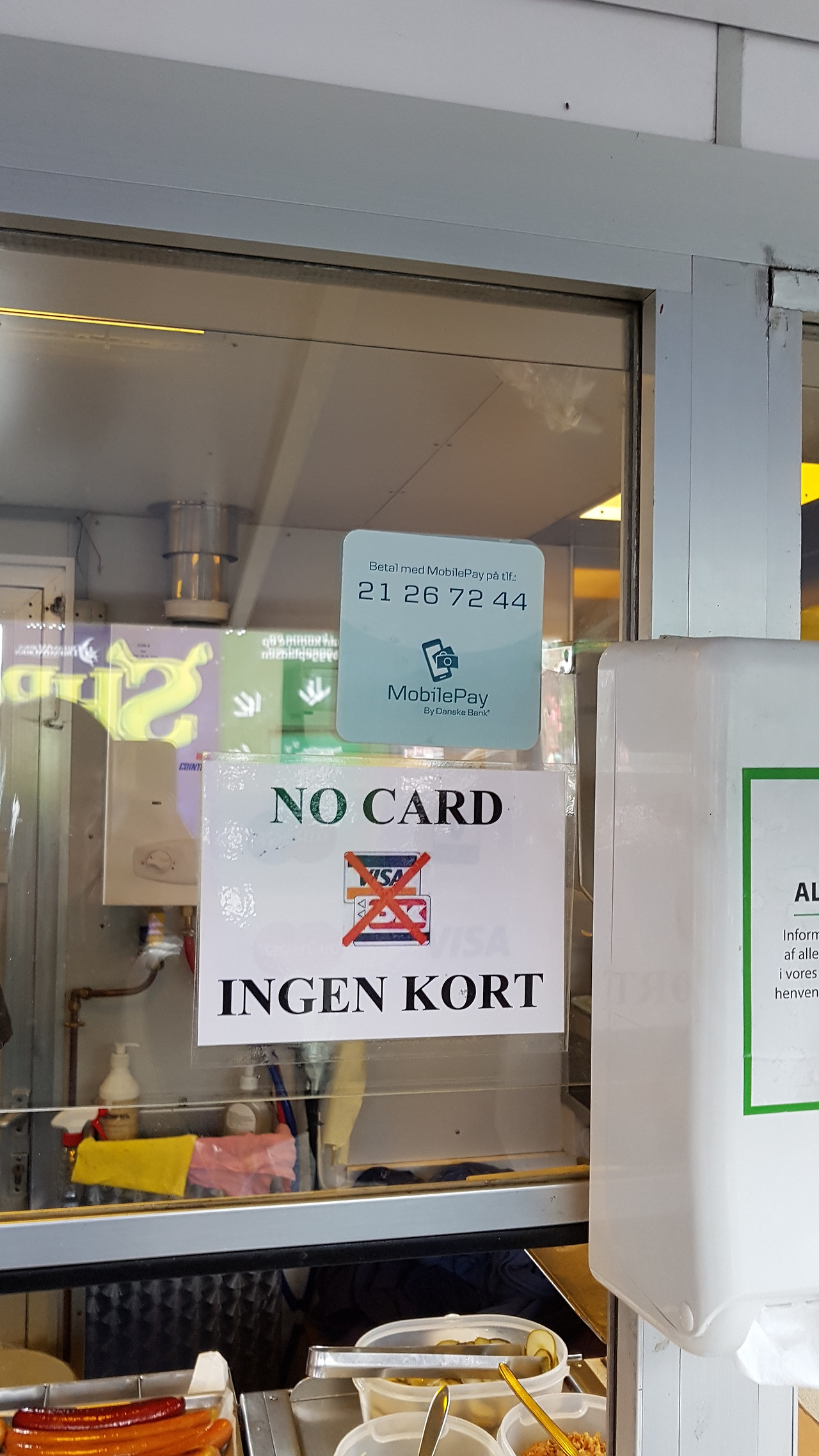 스웨덴보다 덴마크에서 카드를 받지 않는 경우를 좀 더 목격했는데요. 카드 수수료에 대한 상인들의 반발이 거센 편이라, Visa/Mastercard를 거부하고 자신들만의 카드 네트워크인 Dankort를 만들어 보다 저렴한 카드 수수료를 내는 데 이어 이제는 MobilePay를 적극활용하고 있다고 합니다. (Dankort는 우리 나라의 BC카드에 비유하면 적절할 것 같네요.)