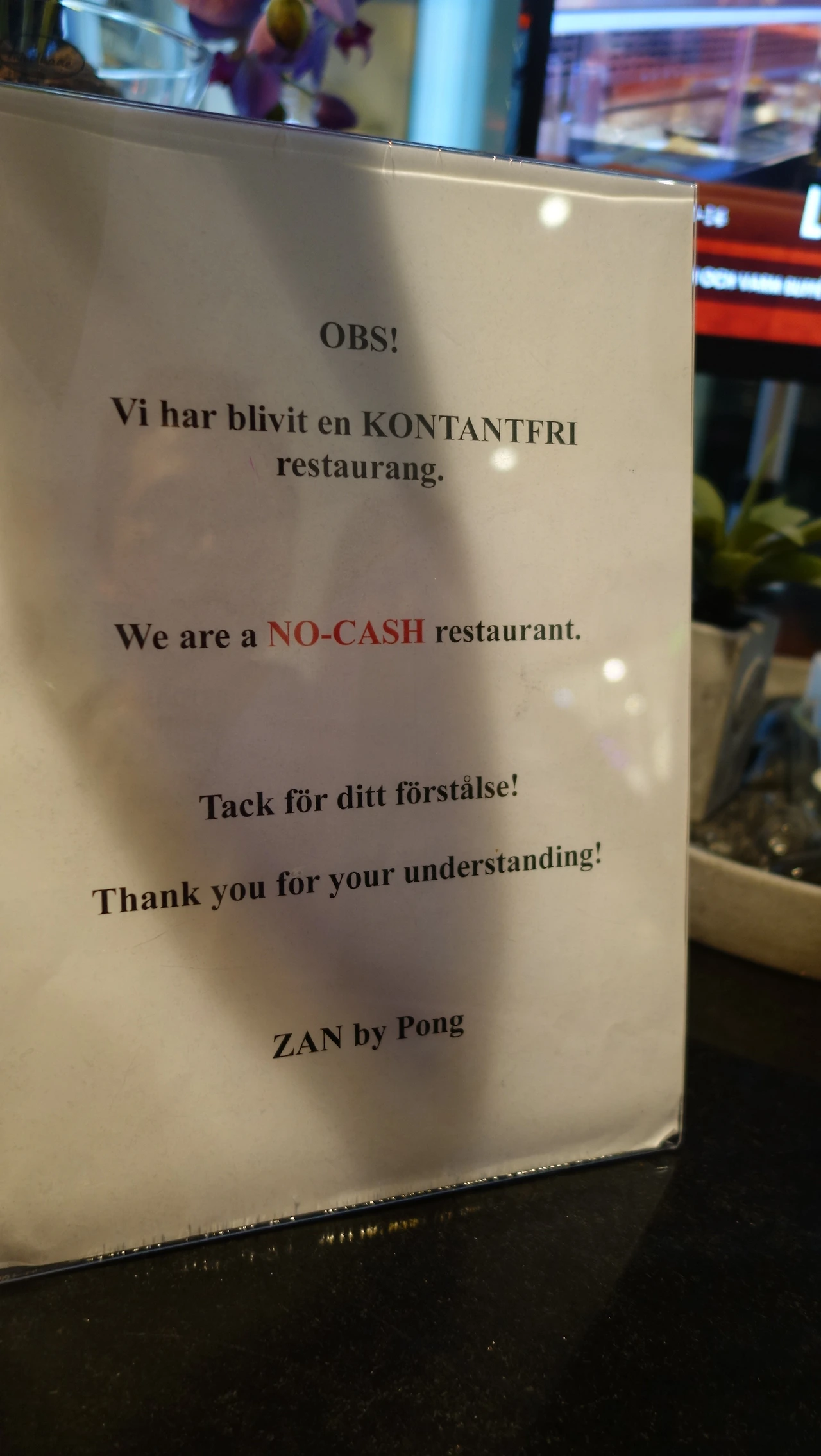 일반 상점은 어땠을까요? 관광객이 뜸한 쇼핑몰의 음식점에 방문하였을 때입니다. 계산대 앞에 현금 대신 Swish를 받는다는 안내문이 붙어 있었습니다. 현금도 받고 Swish도 받는다면 이해가 되는데, 거부를 하다니...노인이나 하이테크를 싫어하는 사람들도 있지 않을까요? 물론 이러한 변화를 싫어하는 사람들도 있지만 법률적으로 현금을 거부할 권리가 상인에게 있기 때문에 빠르게 변해가고 있다고 합니다.