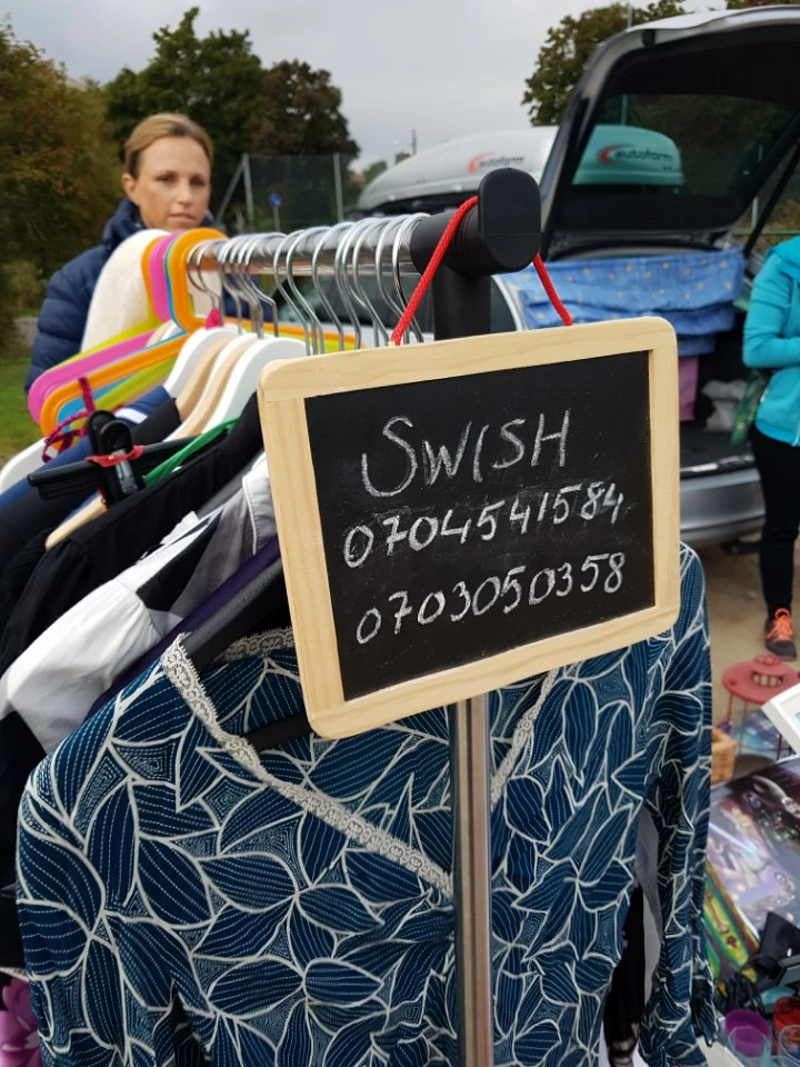 스웨덴에서는 매주 토요일마다 곳곳에서 벼룩시장이 열리는데요. 과연 이곳에서도 현금을 받지 않을까요? 토요일 아침 일찍 Ikea근처에 있는 변두리의 벼룩시장에 방문했습니다. 웨건들이 하나씩 주차되더니 차고에서 옷가지, 장난감, 식기와 가구 등을 꺼내어 좌판을 차리기 시작합니다. 그리고 꼭 이 Swish번호가 적힌 판넬을 걸어 두네요.