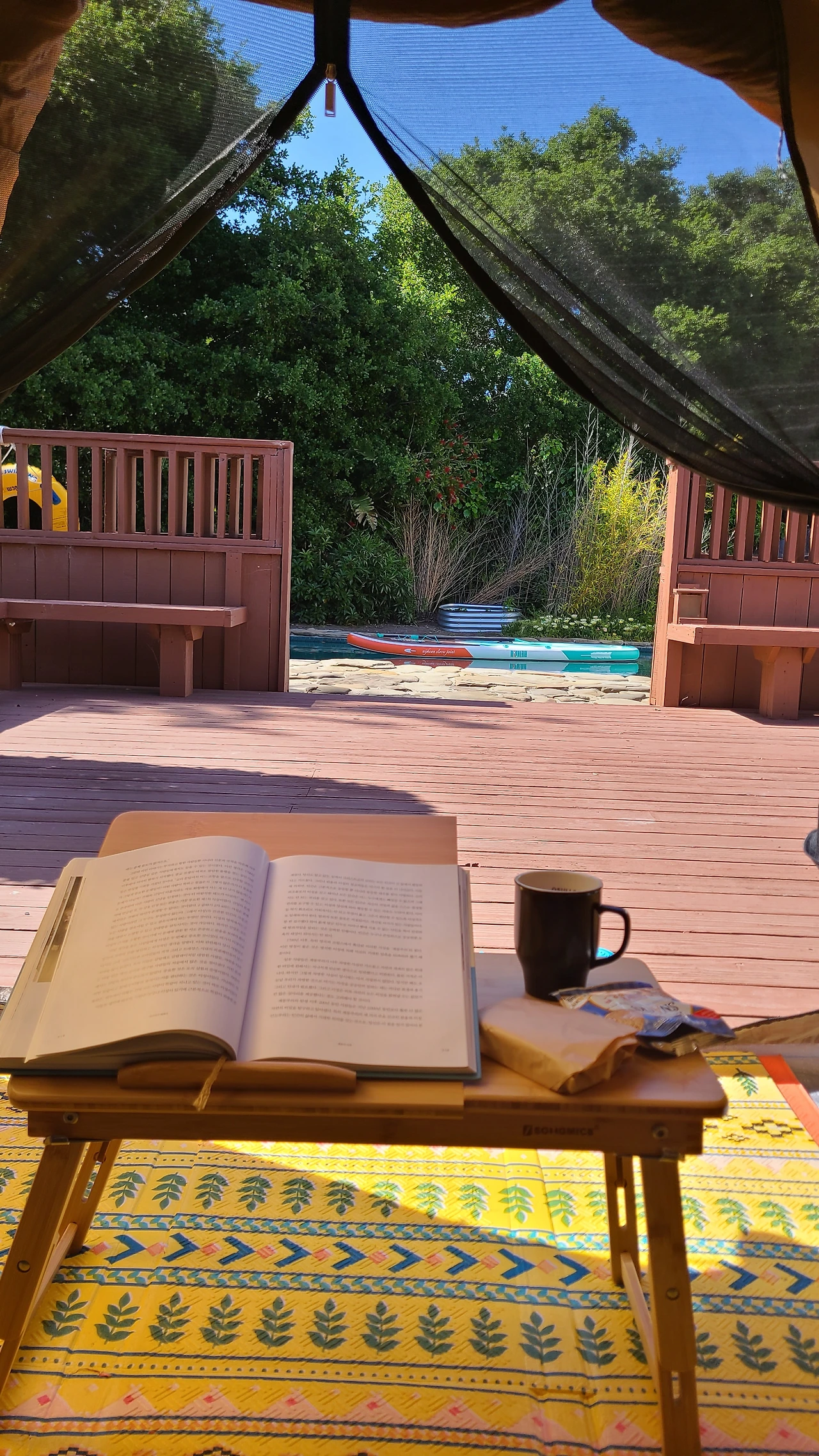 뒷마당에 그늘막 치고 엎드려 누워 있거나 차 마시며 책을 읽는다. 새소리, 바람소리를 듣는다. 긴장을 내려놓고 무턱대고 쉬는 시간. 이밖에 더 무엇을 하랴. 남편은 회사를 다니고 아이들은 학교를 다니니 그들만의 사회가 있지만 내겐 이곳 뒷마당이 전부. 이곳이 내 세상이다. 밖으로 확 트였으되 담으로 둘러쳐진 곳. 내 쉼터. 그래서 요즘처럼 해가 긴 때가 좋다. 심심하고 적적하지만, 말 없이 지내니 타인에게 잘못을 범하기 어렵다. 좋은 곳에 유배온 셈이다.