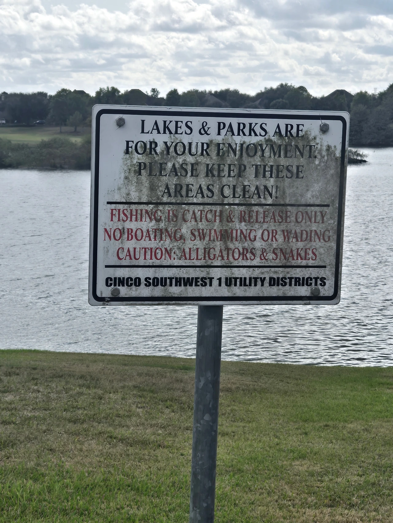 악어가 있단 얘길 듣고 '미국 공무원들 참 너무하네. 경고 문구 정도는 표시해 놔야 하는 거 아니냐.'라고 속으로 구시렁거렸다. 그런 한편 이놈의 악어를 어찌하면 내가 실물을 확인할 수 있을지 탐험심이 생겼다. 주말 저녁 악어 보러 가자며 딸과 함께 나와 악어는 보지 못하고 신선한 저녁 바람만 쐬었다. 3개월 동안 한 주에 두세 번은 호수에 산책하러 나오는데 왜 나는 호수에서 악어를 보지 못한 것은 물론 악어가 있다는 사실조차 인지하지 못했을까. 지나치며 흘깃 본 경고판에서 alligators는 읽지 않고 snakes만 주의 깊게 봤나 보다. 뇌에서 악어는 현실 속에 존재하지 않는다고 보고 무시해 버렸나 보다.