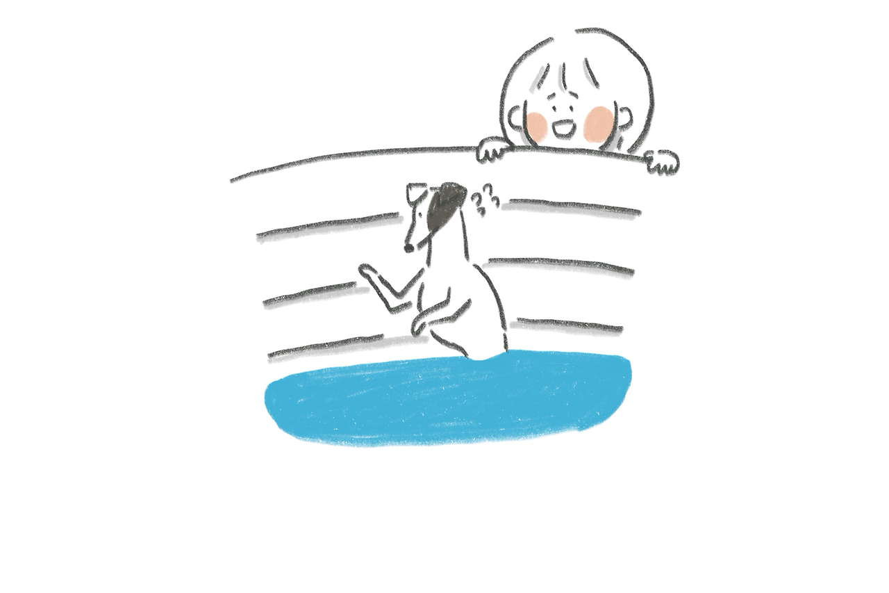 여름이라 한창 길게 자란 풀들 사이로 이리저리 뛰어다녔다. 어느새 첸의 몸은 빨갛게 달아올라있었고 털이 긴 작은 강아지들도 어느새 풀밭에 지쳐 쓰러져 헥헥대고 있었다. 주인아저씨는 애견 운동장의 한편에 있던 커다란 야외용 풀장에 강아지들을 풀장에 한 마리씩 집어넣어주었다. 우리도 따라서 첸을 조심스레 밀어 넣었는데 우리는 다 같이 웃음이 터지고 말았다. 첸은 다리가 길다 보니 물이 겨우 몸통을 젖힐 정도여서 헤엄을 치기는커녕 나가고 싶다고 벽을 붙잡고 사람처럼 계속 서 있었다.