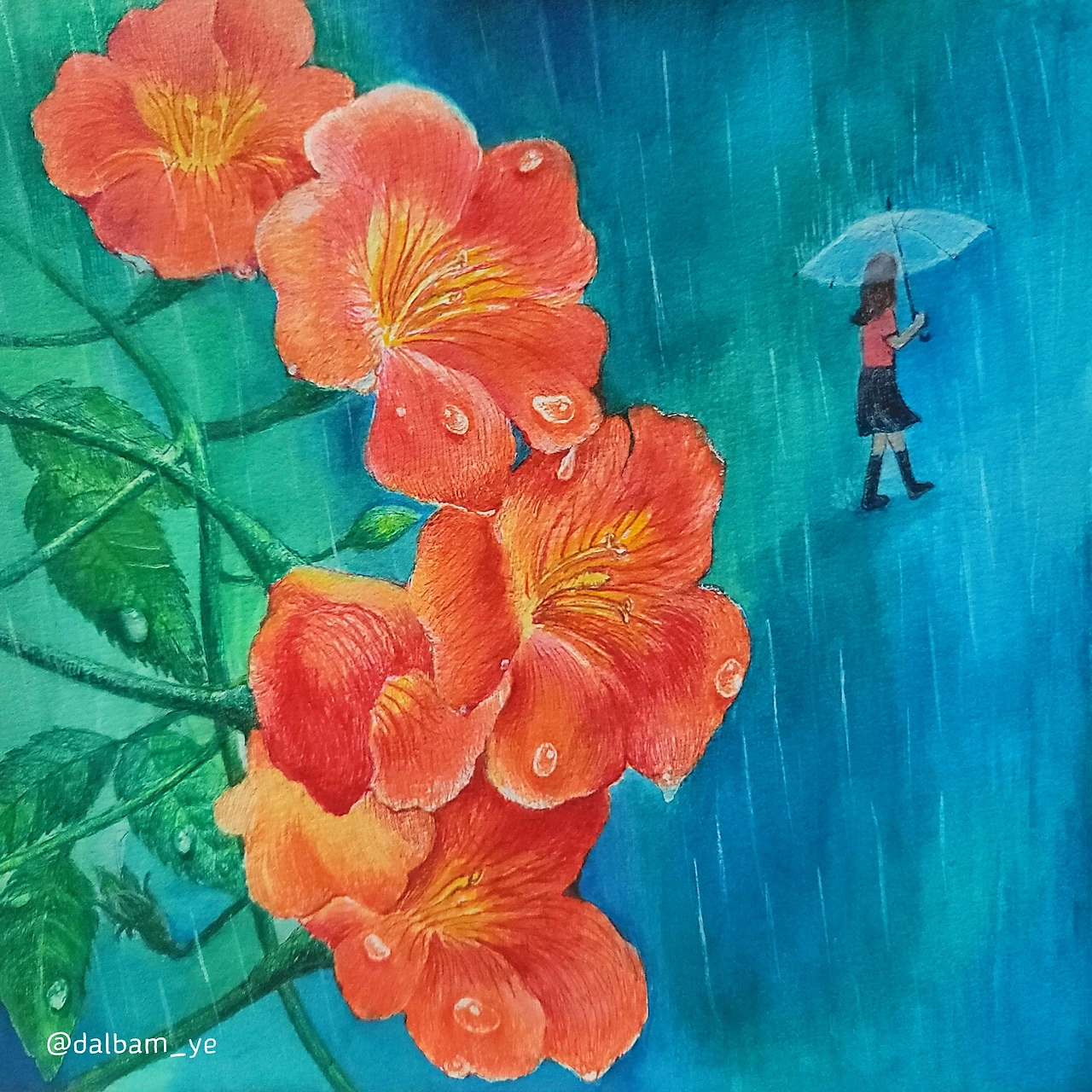 꽃잎 사이로 뚝뚝 떨어지는 빗방울이