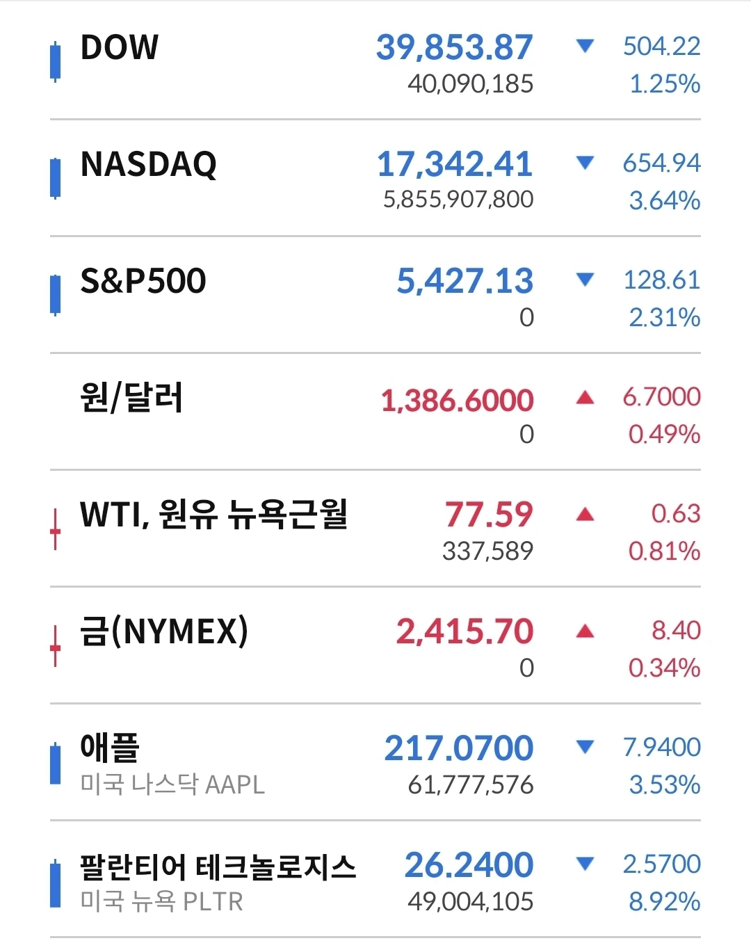지난 밤 뉴욕증시 하락에