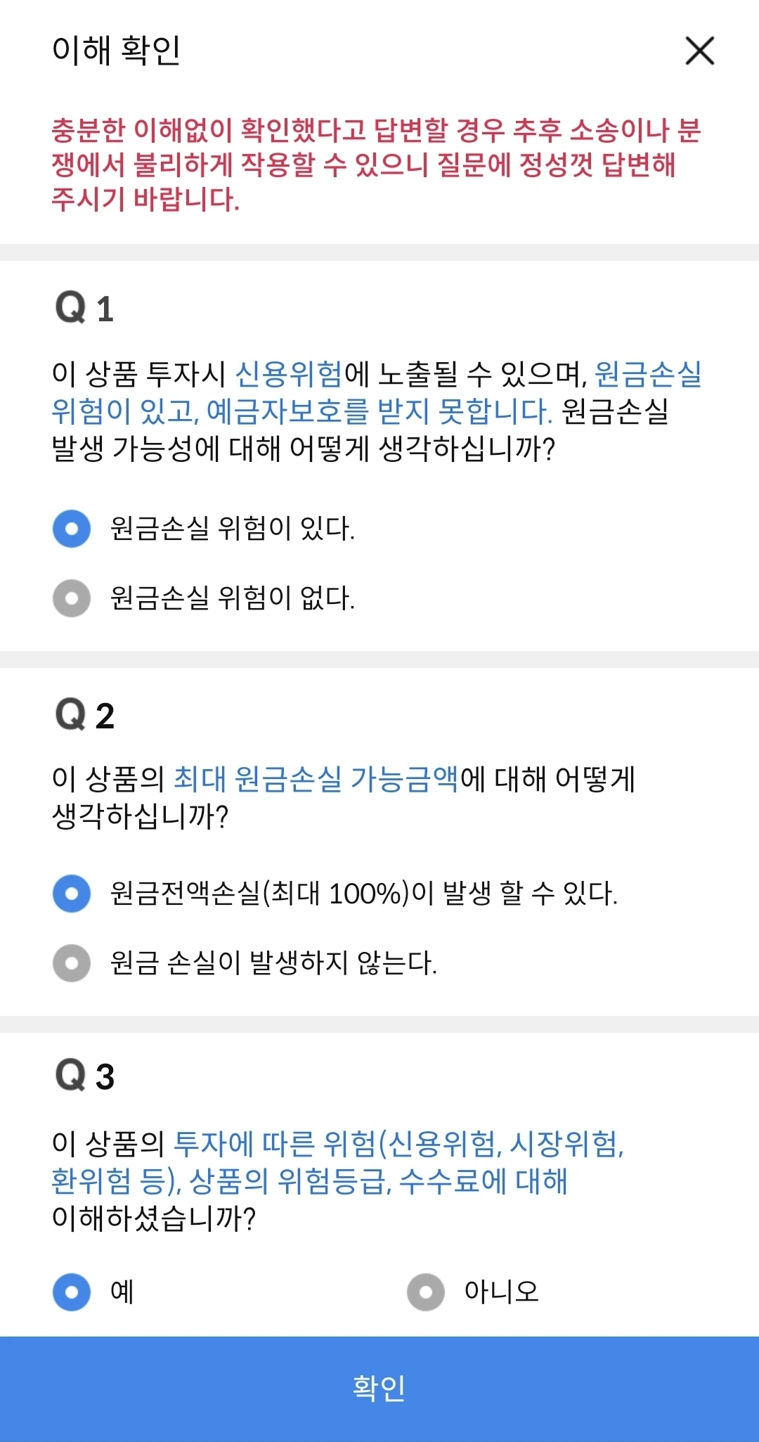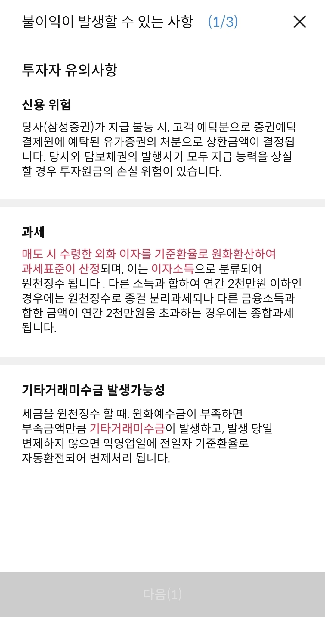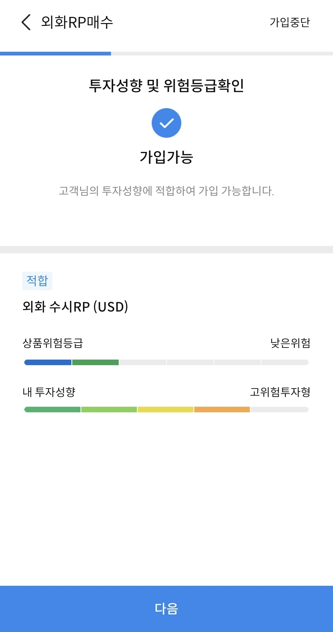 처음 매수하다보니, 일단 투자성향 및 위험등급 확인 절차를 해야 한다. 이게 위험 자산으로 원금손익이 발생할 수 있음을 지속적으로 증권사가 알려준다. 너무 과도할 정도로 계속 물어보고, 동의를 구한다. 이렇게 위험상품인가 생각이 들 정도로 물어 본다. "다음" 버튼을 계속 누르면서 여기에 달러를 묻어둬도 되나 의구심이 계속 들었다.