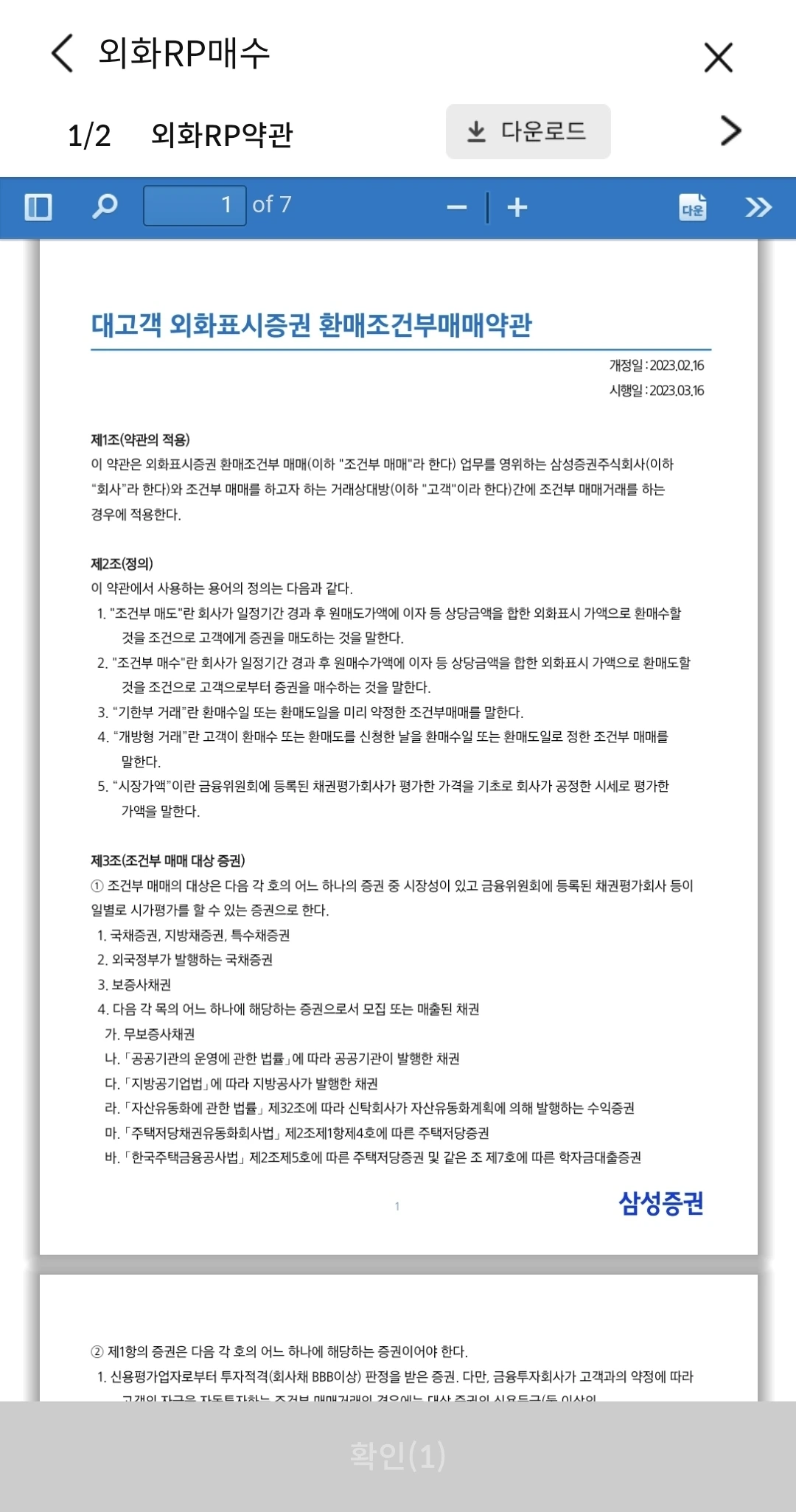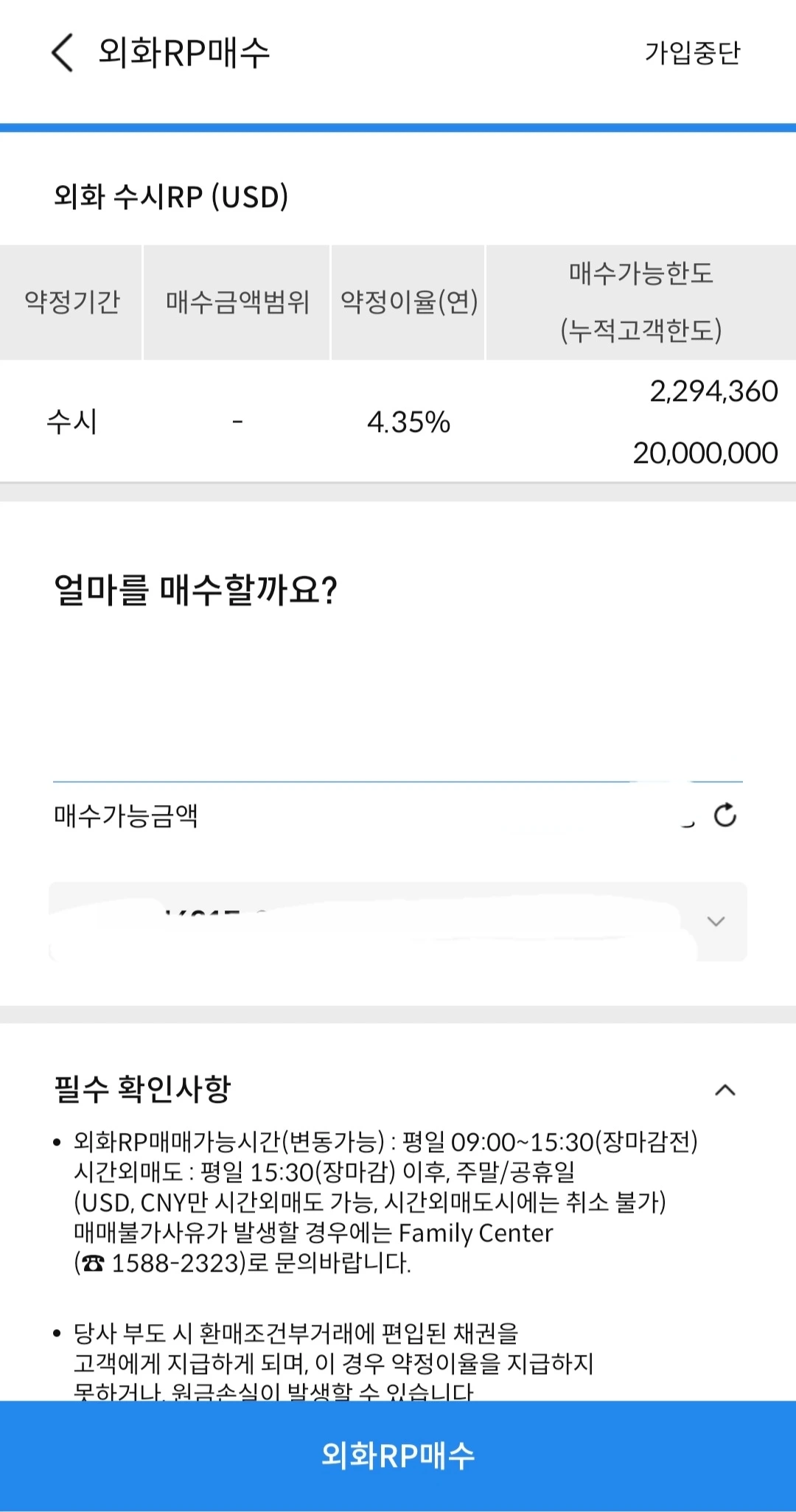 언제라도 달러를 빼서 주식에 투자를 할 수 있어야 하기에 일단 "외화 수시RP"로 매수를 진행했다. 들고 있던 달러로 전부 매수 했다.삼성증권 부도나면 채권을 지급하고, 약정이율을 못 준다고 써 있었다. 설마 삼성증권이 부도 날까 라는 생각으로 매수 완료 했다.