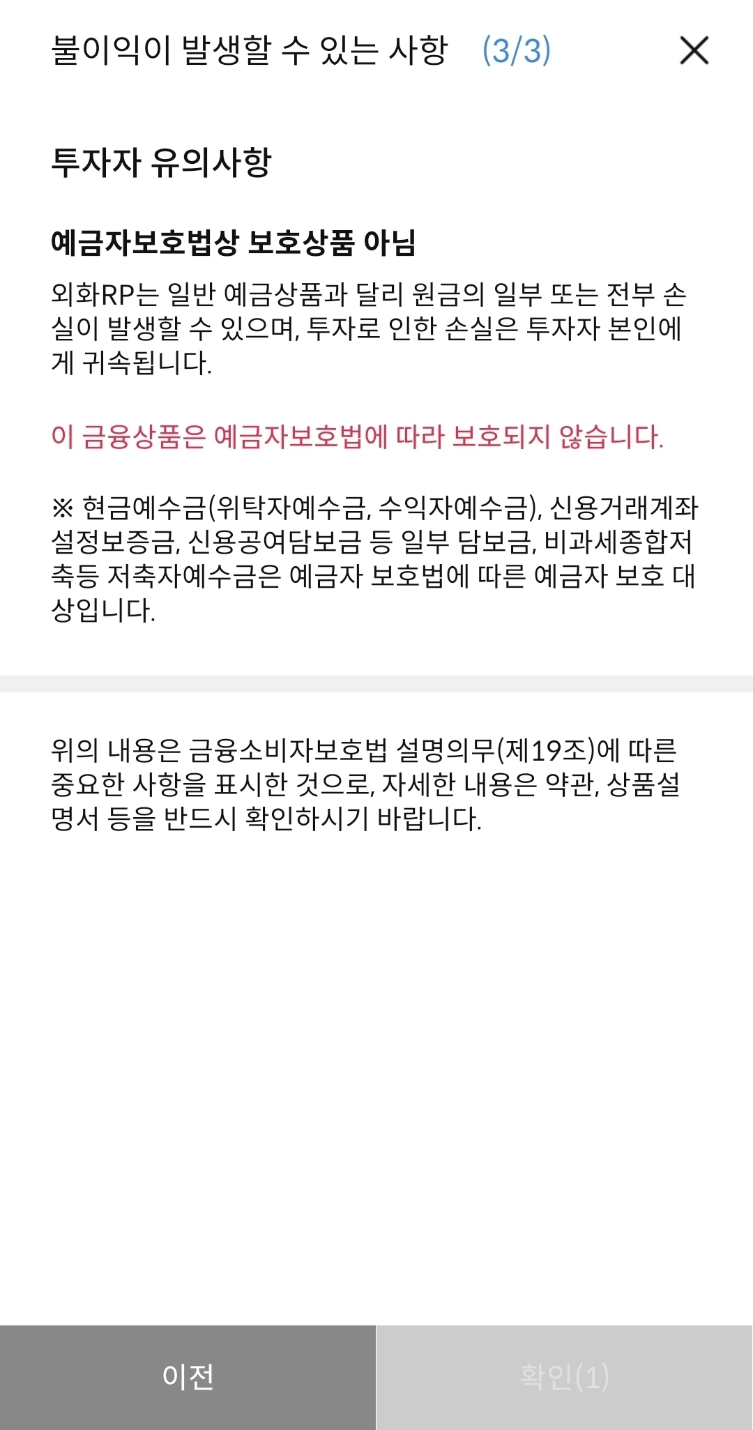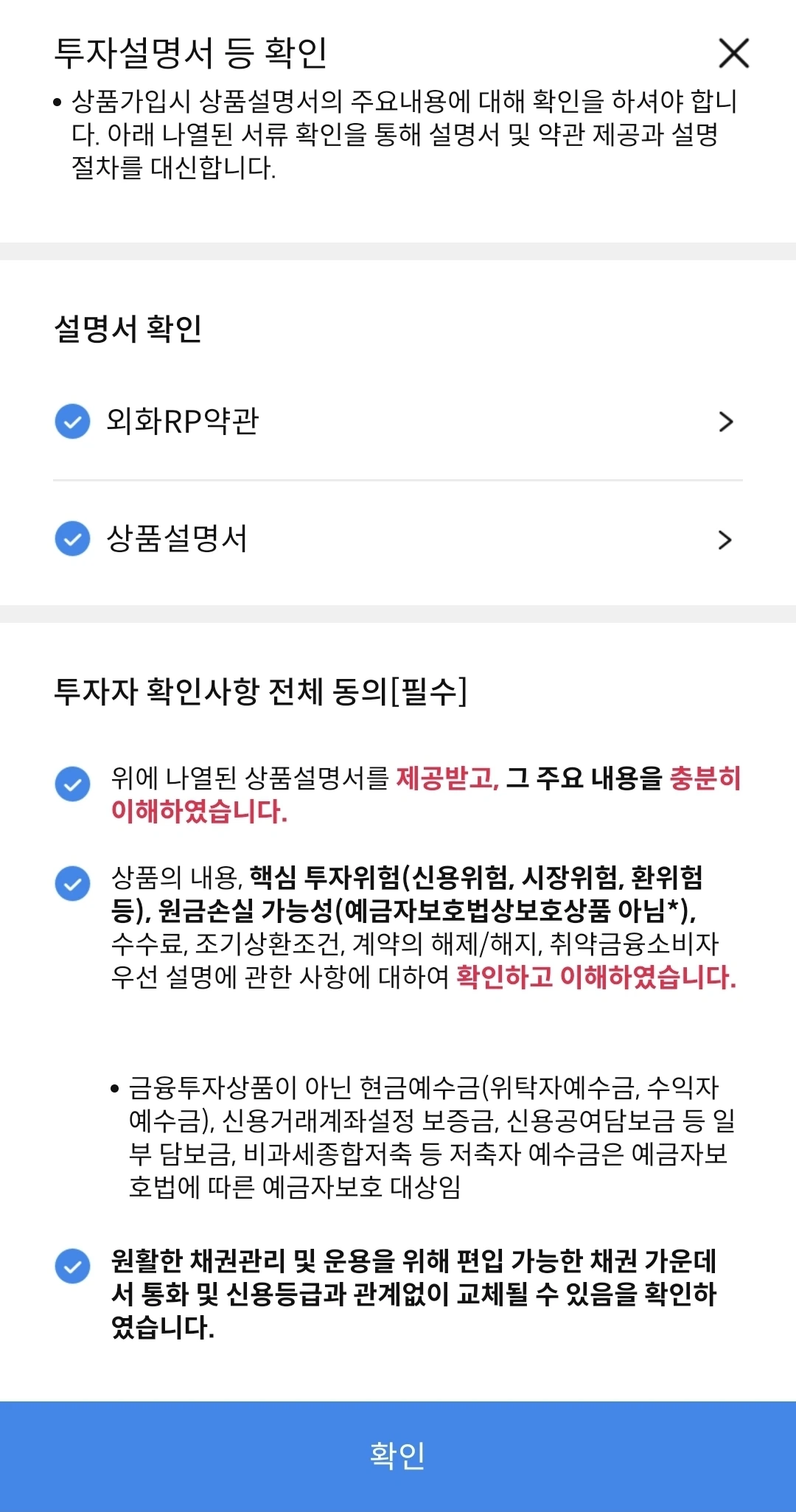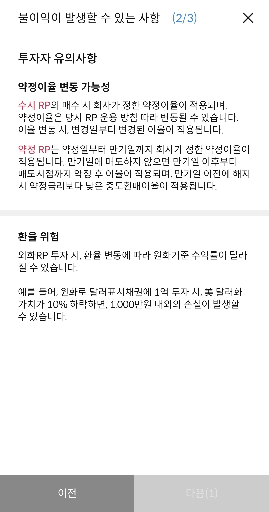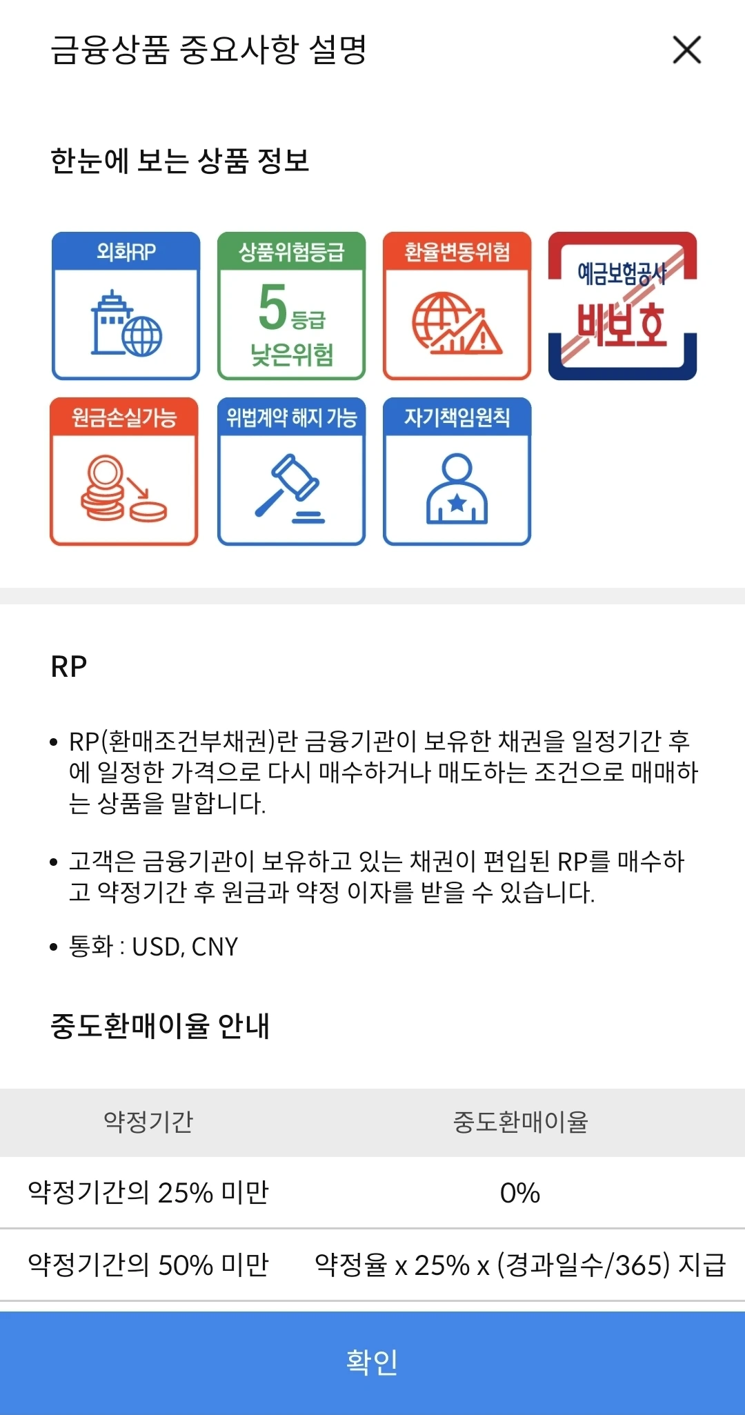 > 이 금융상품은 예금자보호법에 따라 보호되지 않습니다RP는 자산가격 변동, 신용등급 하락 등에 따라 투자원금의 일부 또는 전액 손실이 발생할 수 있으며, 그 손실은 투자자에게 귀속됩니다.