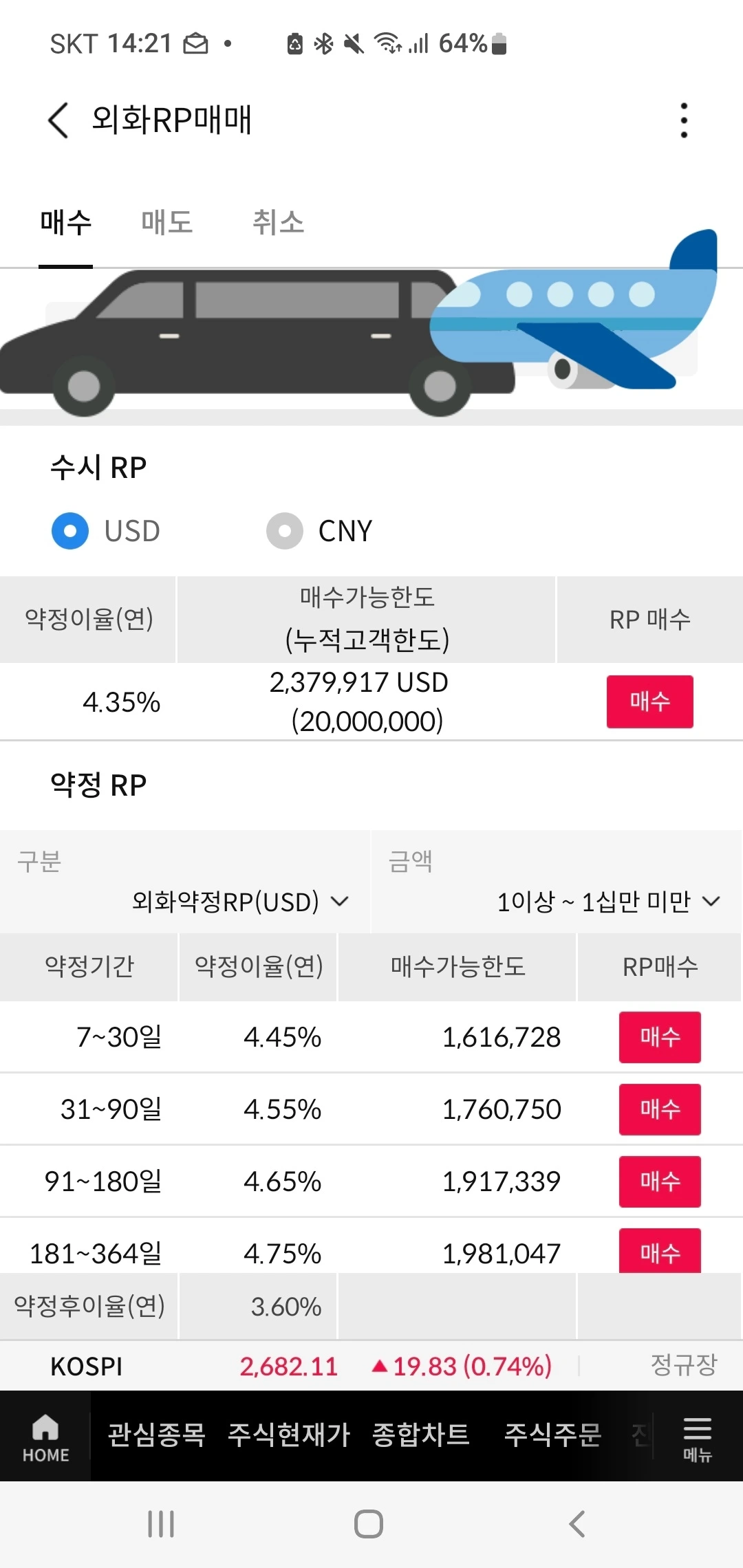 외화RP매매에 들어가면, 3가지 메뉴가 있다. 상단에 "매수/매도/취소" 메뉴가 보인다. 일단 "매수"를 누르고 들어가니, 수시RP와 약정RP가 보인다. 수시RP는 달러와 위안화를 거래할 수 있나 보다.