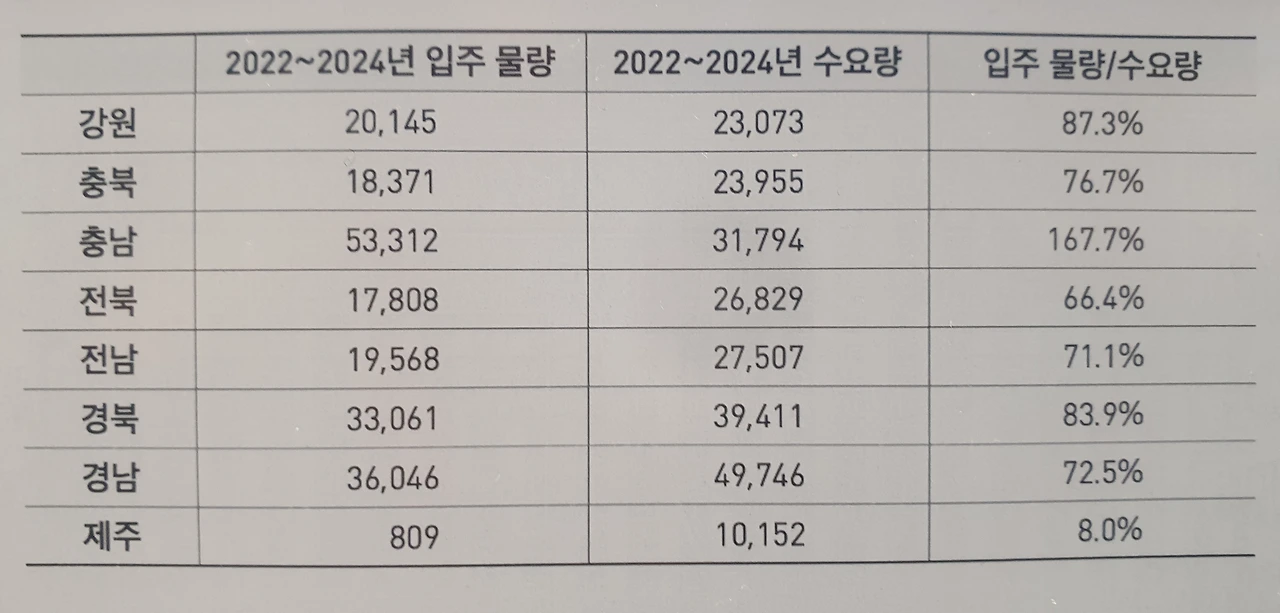 28) 입주 물량과 미분양 물량으로 파악할 수 있는 공급량은 매수 시점이 아닌 매도 시점을 염두에 두어야 한다. 개인투자자는 양도세 기본세율 적용을 위해 2년간 보유해야 함로, 2년 뒤 공급량을 체크해 엑시트 전략을 세우는 게 좋다.