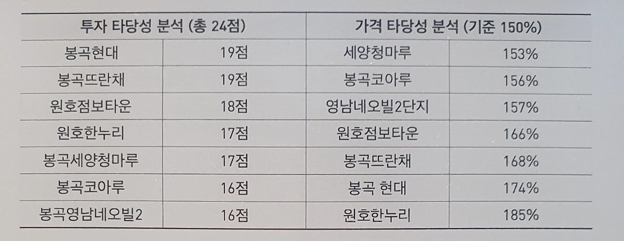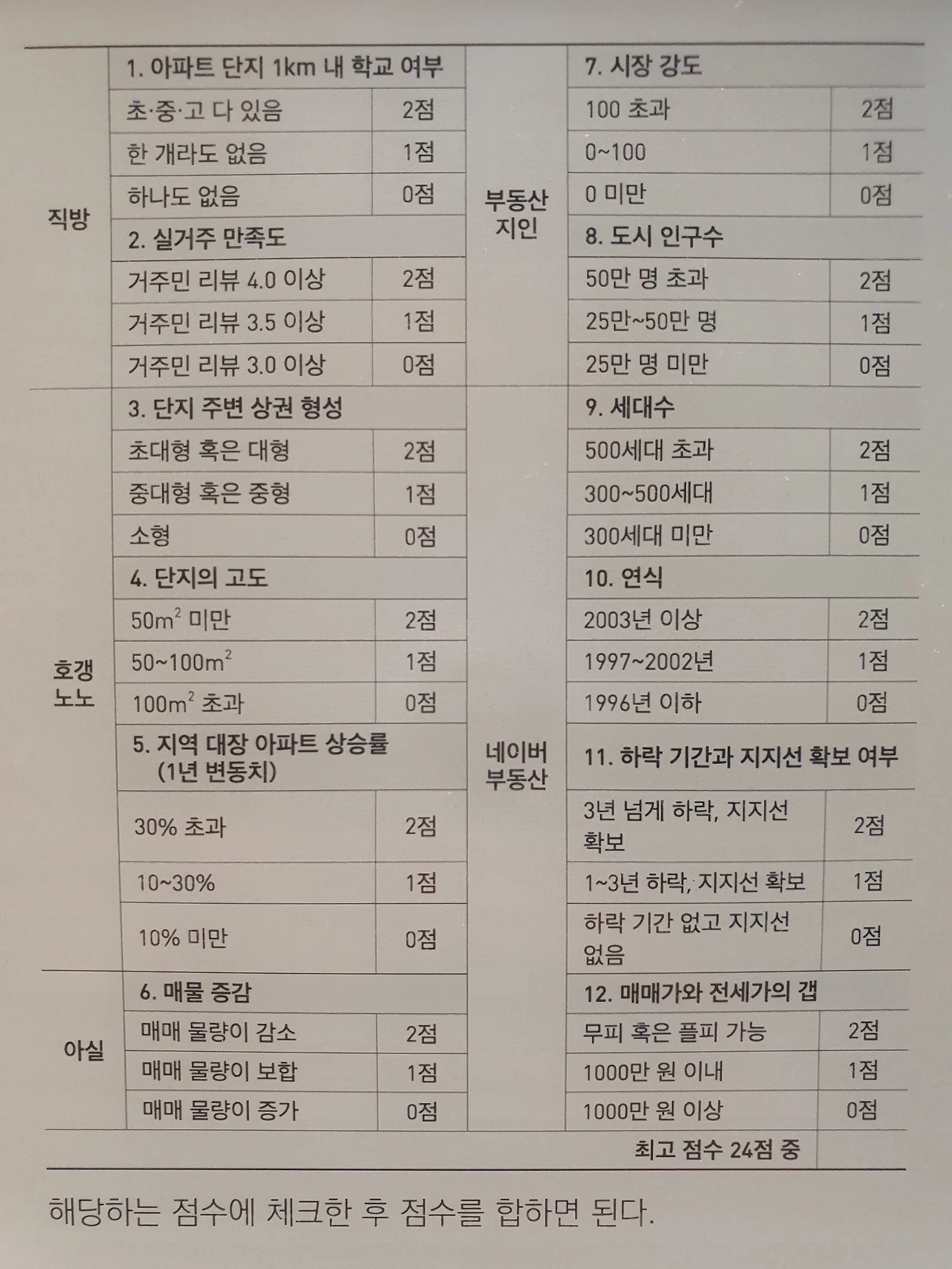 12개 문항 총 24점 만점이다. 24점에 가까울수록 그 아파트는 당시 시점에서 투자하기 좋은 물건.