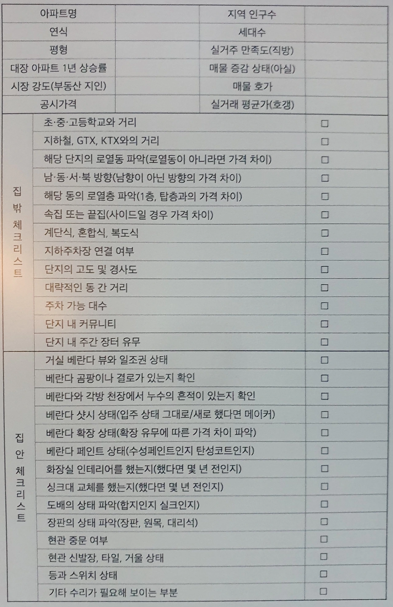 54) 임장 지도가 임장 계획표라면 임장 체크리스트는 하나의 집을 볼 때 무엇을 확인 해야 하는지 목록화한 도구다. 처음엔 불편하더라도 딱 100채만 체크리스트와 함께 임장을 해 보면, 나중에는 체크리스트 없이도 어느 정도 견적을 낼 수 있다.