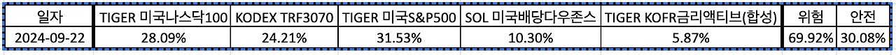 이번 주 금리인하 영향으로 대부분 상승으로 마감했고, 매주 금요일에 무지성 매수 진행 중인데, 이번 주도 높은 가격으로 매수가 진행되었다. 위험자산과 안전자산의 비중을 70%:30%로 유지하면서 매수 진행 중이고, 52주 기준으로 분할 매수하고 있는데, 벌써 21주 분할 매수가 진행되었다. 이번 주부터는 기록으로 남겨서 추이를 지켜보고자 한다.