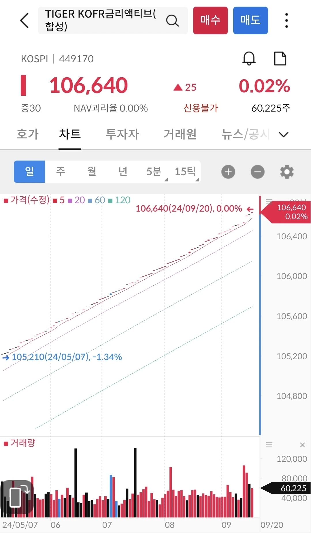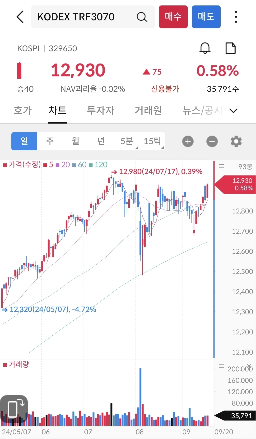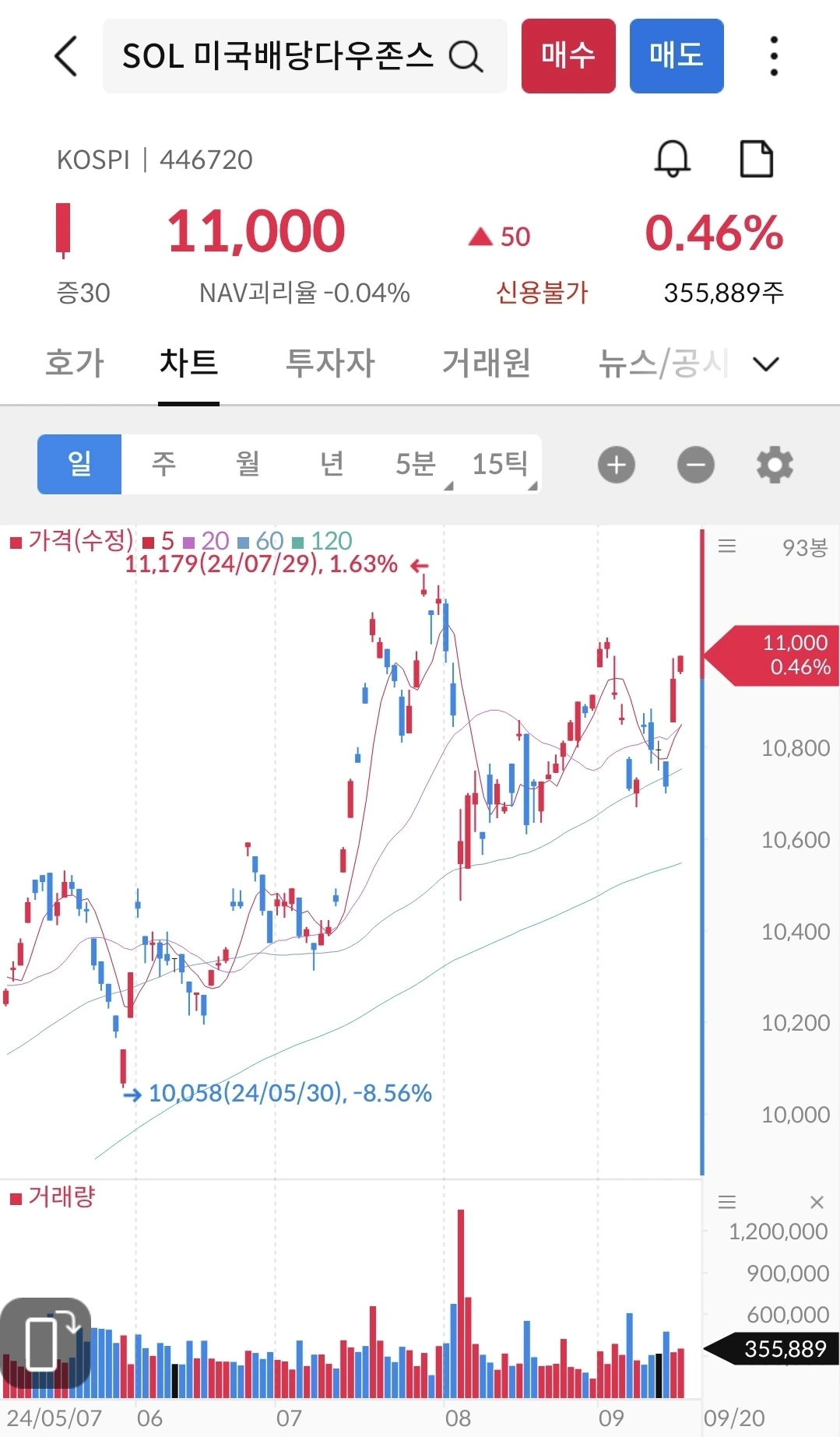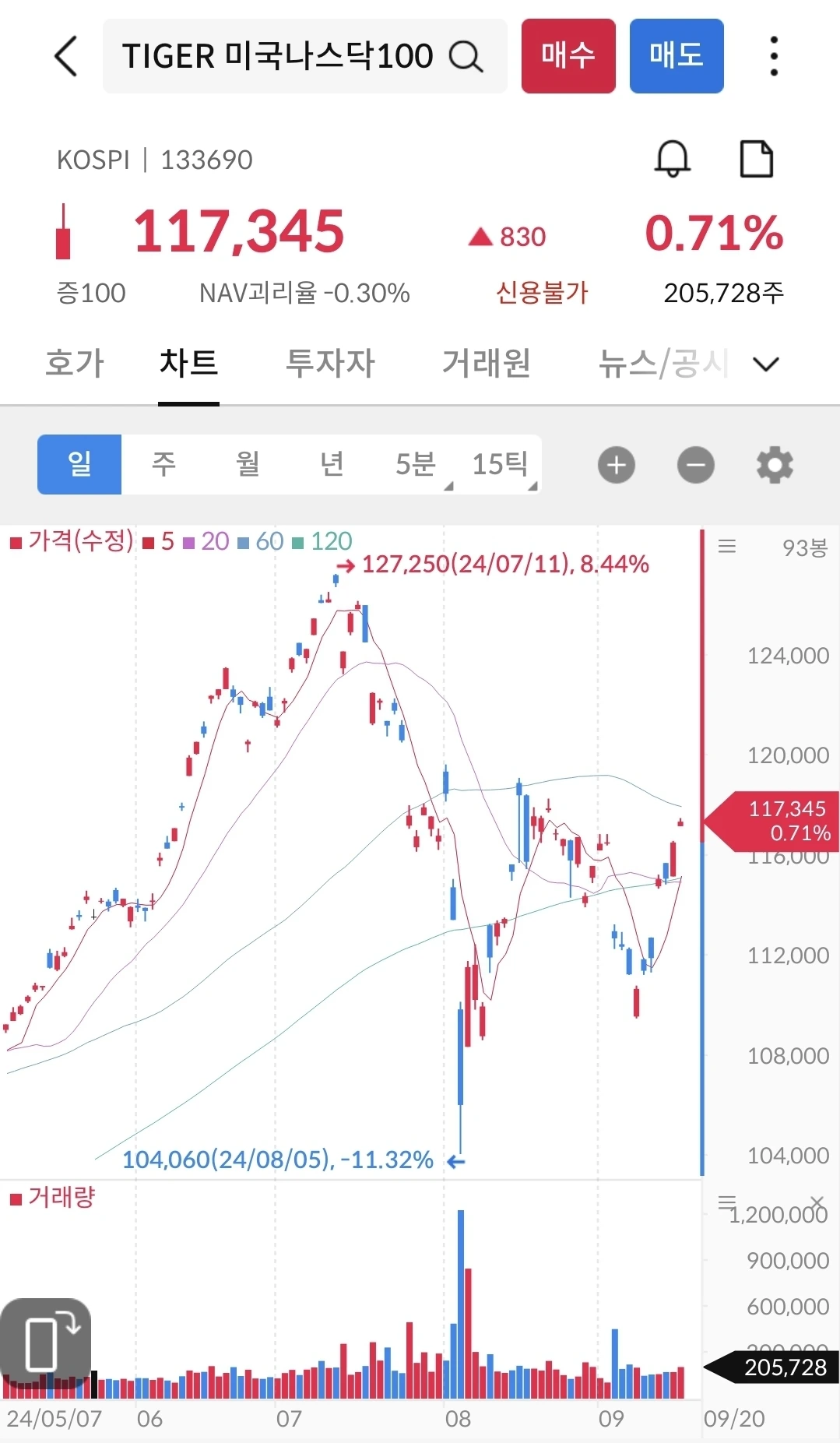이번주는 117,345로 마감했다. 19일 새벽에 있었던 금리인하의 영향으로 목/금은 상승으로 마감을 했다. 그래프가 매끈하게 보이지 않는 이유는 아마도 환노출이 된 미국 지수여서 그런 듯 보인다. 7월에 127천원이었던 적이 있었기에 4분기에 추가 인하가 되면, 아마도 년말에는 127천원을 넘기지 않을까 예상해 본다. 분할매수 중인 나에게는 떨어지는게 유리한데, 미래를 예측할 수가 없다.