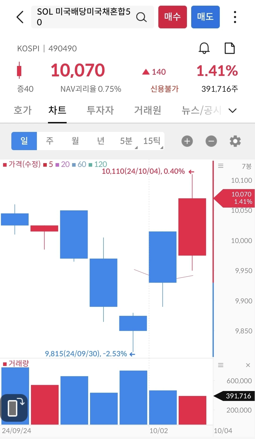 지난 주에 서대리TV를 보고 포트폴리오를 바꿨다. 지난 9월 23일에 런칭한 "SOL 미국배당미국채혼합50"을 안전자산 30%에 편입을 했다. 이번 주에 추가 250주를 매수하고, 금요일에 정기 매수를 했다. 1만원으로 런창했는데, 지난 주에 1만원 밑으로 떨어졌다가 어제 다시 1만원을 넘었다. 나는 대부분을 9800원대에 매수했다.