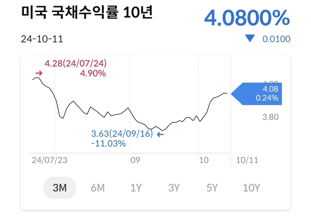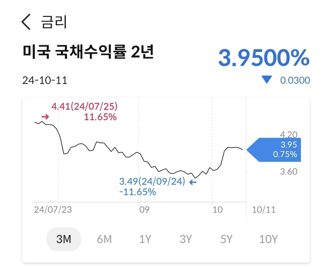 국채 2년물과 10년물이 4%를 넘었다가 2년물은 3.95%로 마감했다. 국채금리 인상은 국채가격 하락이므로, 국채 매수에 좋은 기회였다는 말이기도 하다. 다행이도 장단기 금리 역전현상은 발생하지 않았다.