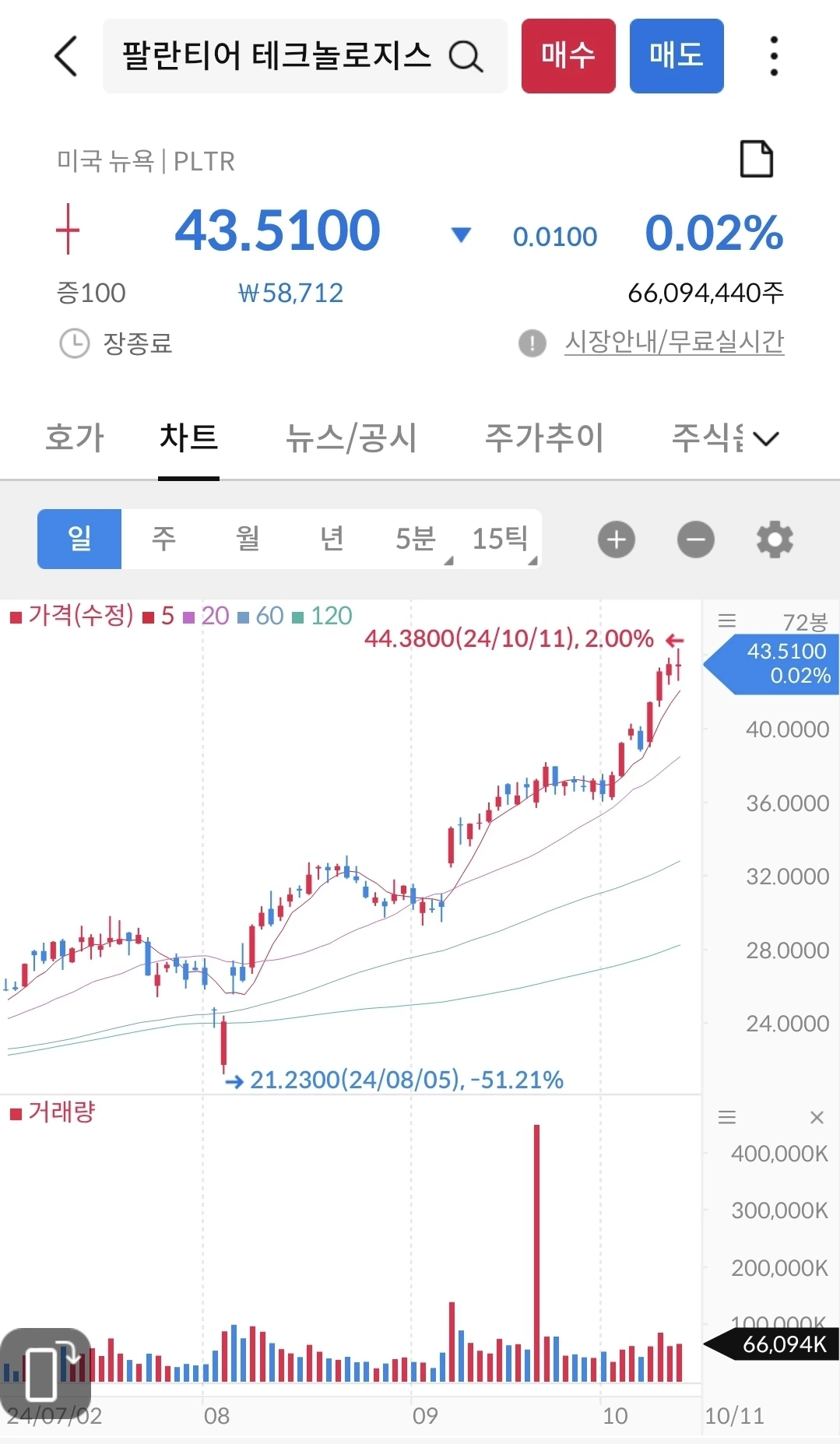 지난 주 40.01에서 이번 주 43.51로 마감했다. 전주비 7.8% 상승했다. 이 친구에게는 무슨 일이 있길래 가파르게 우상향 중이다. 아마도 3분기 실적 발표되면 더 가파른 우상향을 보여 줄 수도 있다. 이미 많이 올라서 추가매수 하기에도 부담이 된다. 가치가 있는 회사는 시간이 갈수록 더 오를 수 있다.