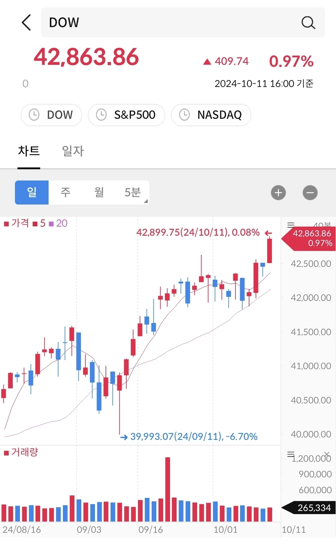 지난 주 42,352에서 이번 주 42,863으로 마감했다. 전주비 1.2% 상승했다. 특히, 수요일과 금요일에 크게 상승했다. 11일에는 사상 최고치를 갱신했다. 큰 악재가 없다면, 이 추세는 계속 이어질 듯 하다.