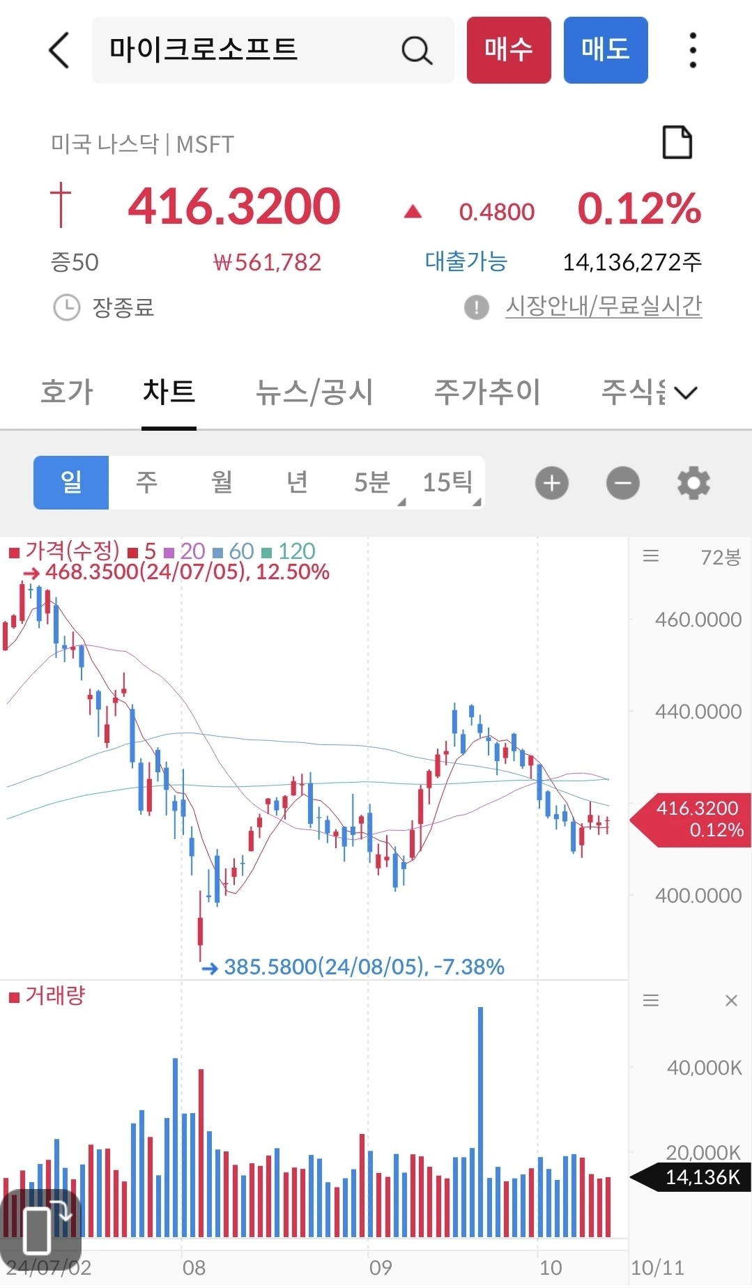 운이 좋게 9월말에 1300원대 초반에 달러를 매수해서 마이크로 소프트 2주를 샀다. 환율을 보고 필요시 달려를 적시에 구매하는 것도 운이다. 어느 정도 흐름을 읽고 있으면, 좀 더 수월하게 달러를 매수할 수 있다.