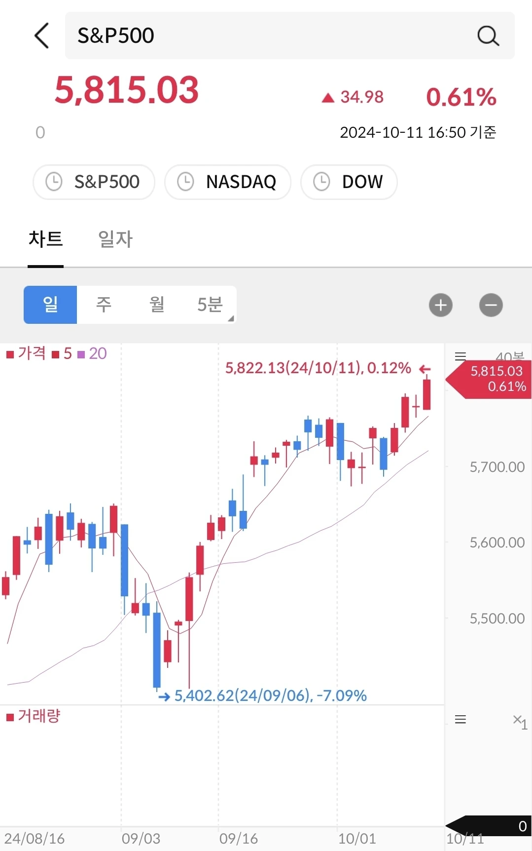 지난 주 5,751에서 이번 주 5,815로 마감했다. 전주비 1.1% 상승했다. 화요일 이후 지속 상승해서, 처음으로 5,800을 넘었다. 상승세는 꺽이지 않고 지속 되고 있다. 언제까지 갈지 궁금하다.