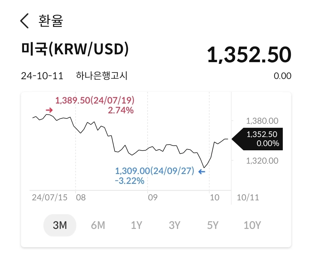 지난 주 1,347원에서 이번 주 1,352원으로 마감했다. 전주비 0.4% 상승했다. 9/27일 바닥을 벗어나서 원화는 지속 약세 중이다. 지금의 상황은 미국 금리인하 동결 등의 뉴스는 강달러는 유지가 될 것 같고, 당분간 원달러 환율은 떨어지지 않고, 유지되거나 더 오를 수도 있겠다.