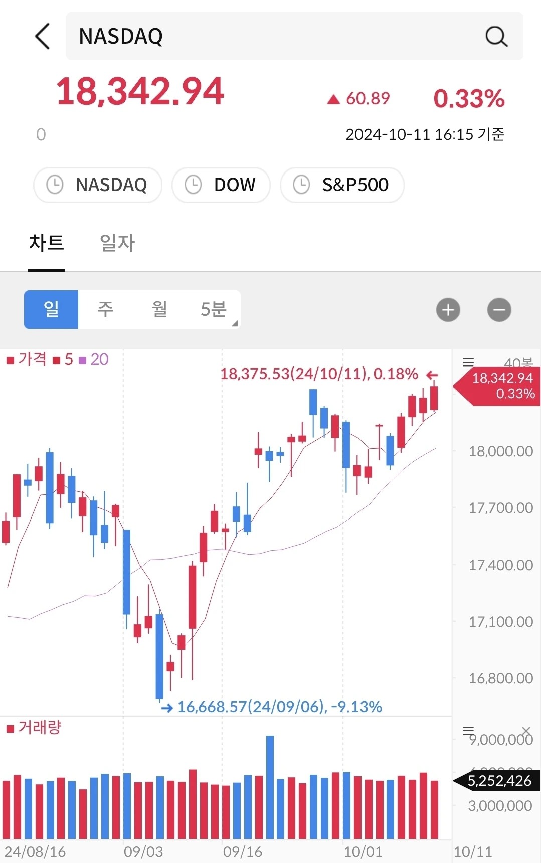 지난 주 18,137에서 이번 주 18,342로 마감했다. 전주비 1.1% 상승했다. 화요일부터 상승하더니 금요일에 최고치로 마감했다. 아마도 이 추세는 이어질 듯.