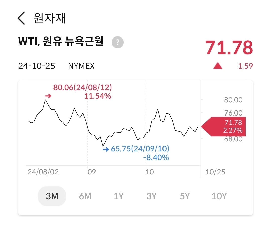 이스라엘의 이란 공격으로 앞으로 유가는 더 상승할 것으로 보인다. 여기에 이란이 이스라엘을 향해서 보복을 시작하면 유가는 더 영향을 많이 받을 것 같다. 현재마감은 이스라엘의 이란 공격 내용이 반영이 안되었기 때문에 월요일이 되면 강한 반등이 올 듯 하다. 그래도 80불 이하로 유지되면 크게 문제는 안될 듯 하다.