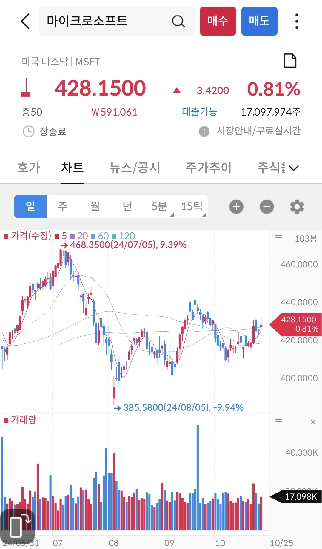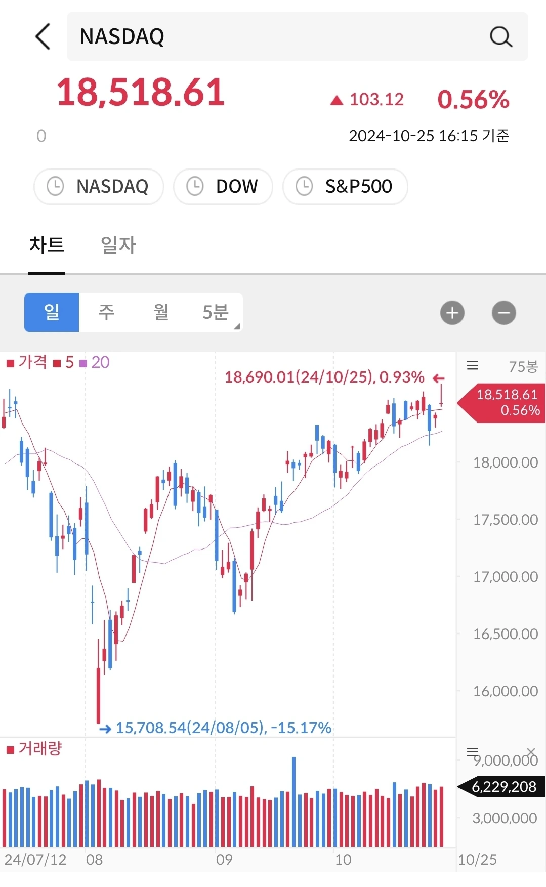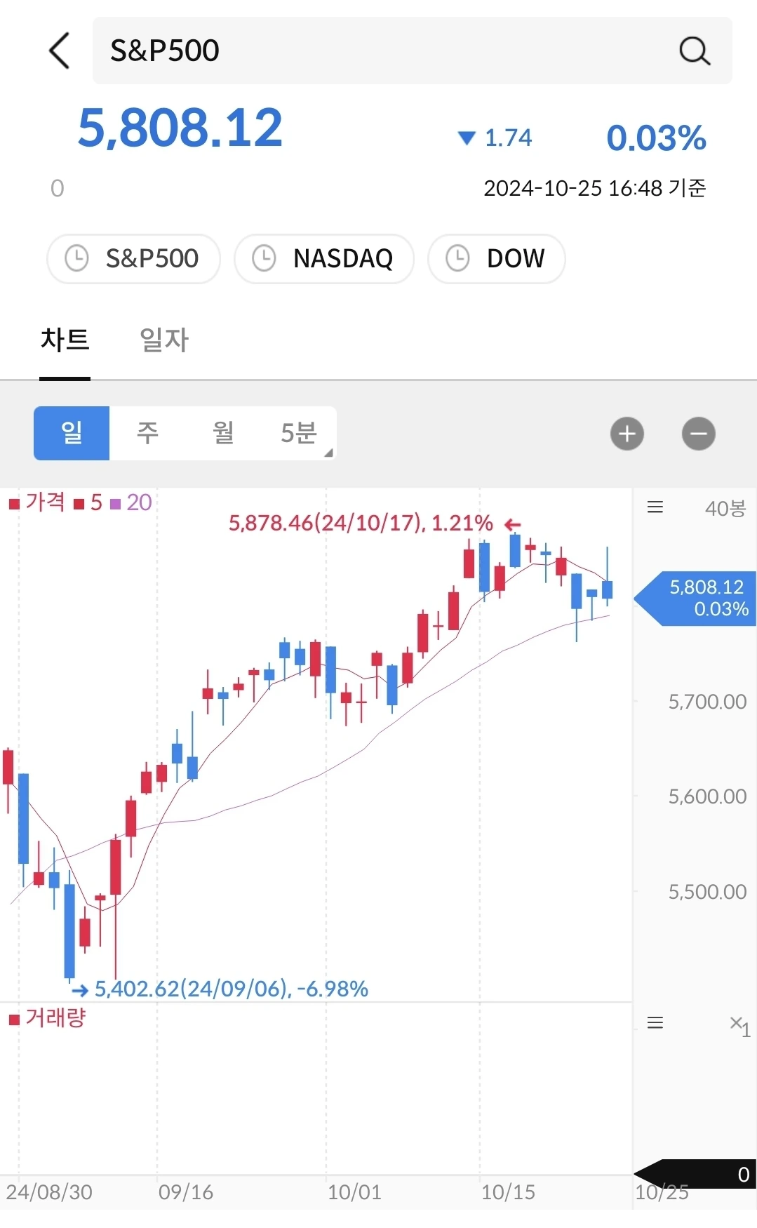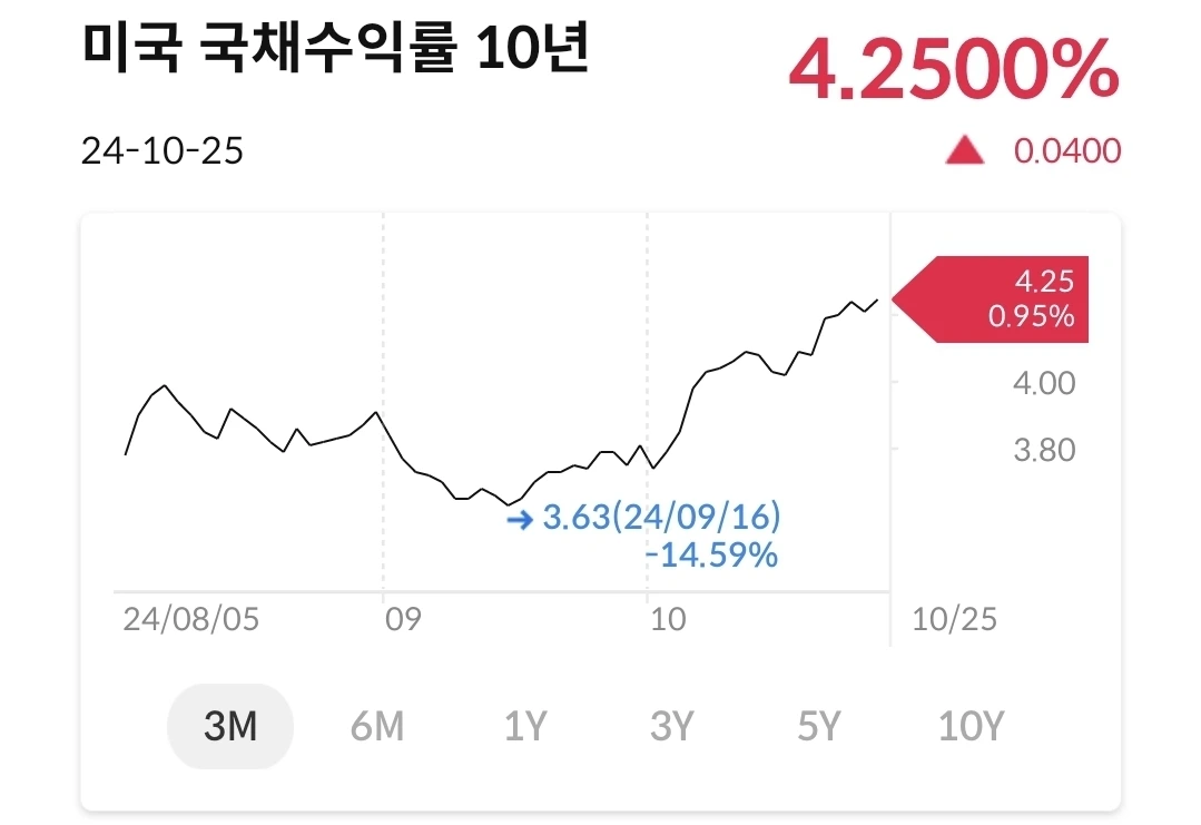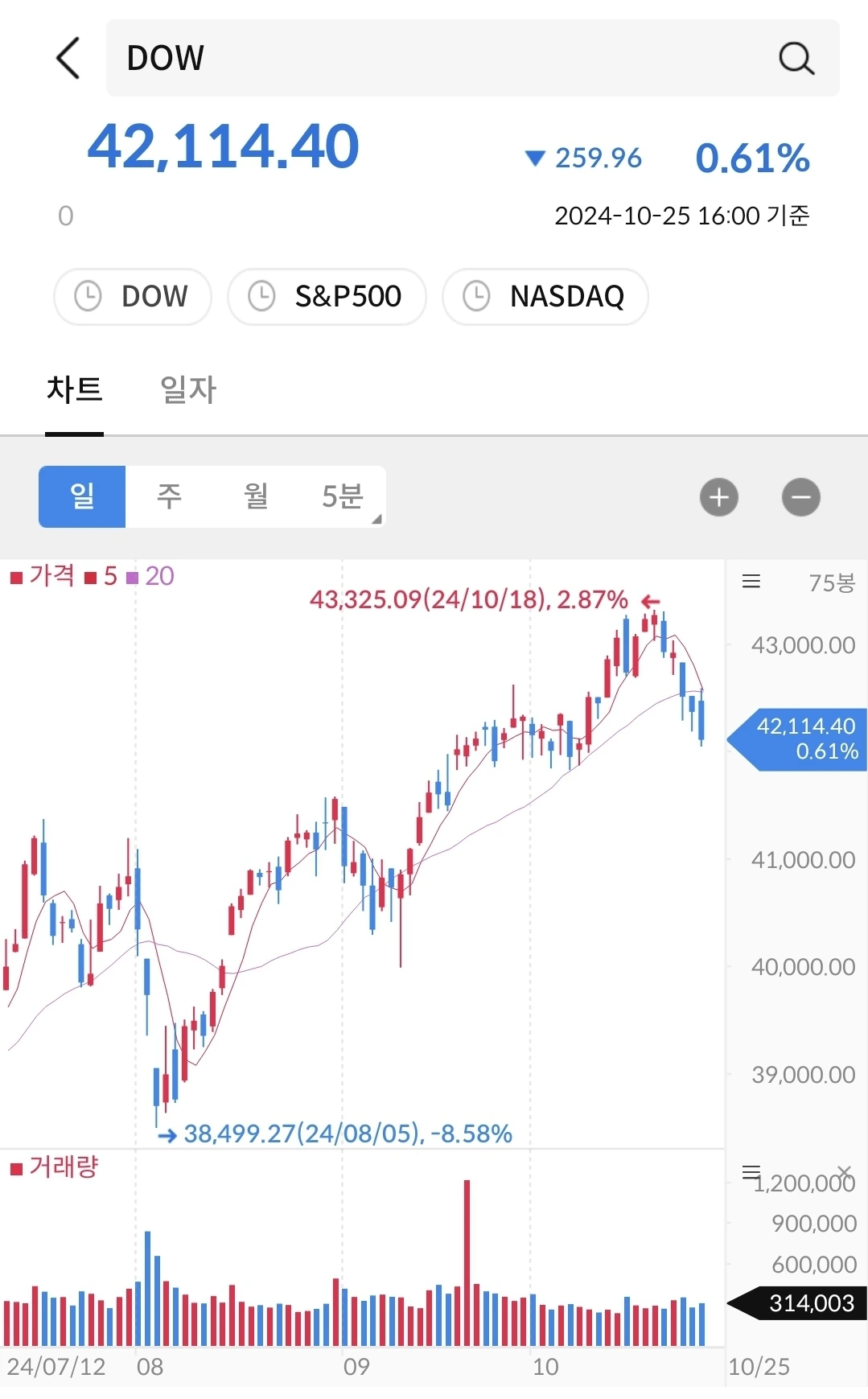다우지수는 지난 1주일 동안 꾸준히 하락 중이다. 아직은 42천선이라서 그리 낮은 숫자는 아니다. 여러 기업의 실적 발표가 나오면 올라 가지 않을까? 기업들의 3분기 실적이 기대이상으로 좋게 나오고 있다. 미국 경제 침체 우려와는 달리, 기업 실적은 좋은 편이다.