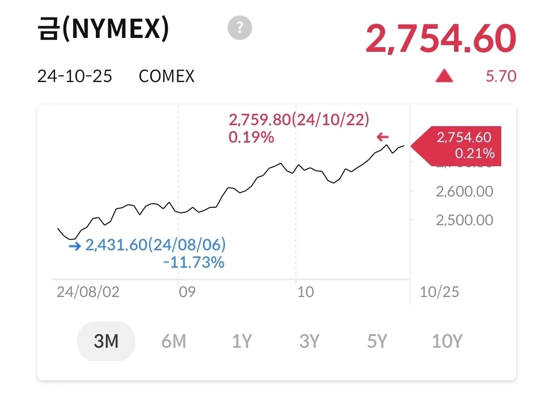 금가격은 쉬지 않고, 상승 중이다. 이 상황이라면 올해 내에 3천불을 넘어 갈 듯 보인다. 급등하는 것은 아니지만 쉬지 않고 꾸준히 우상향 중이다. 불확실성이 많은 시점이라서 안전자산 금에 대한 수요가 많아진 듯 보인다.
