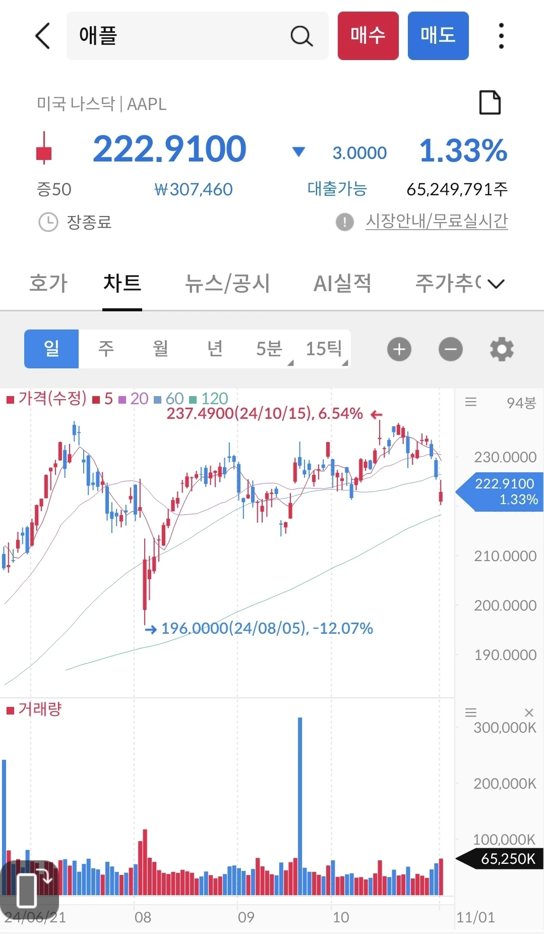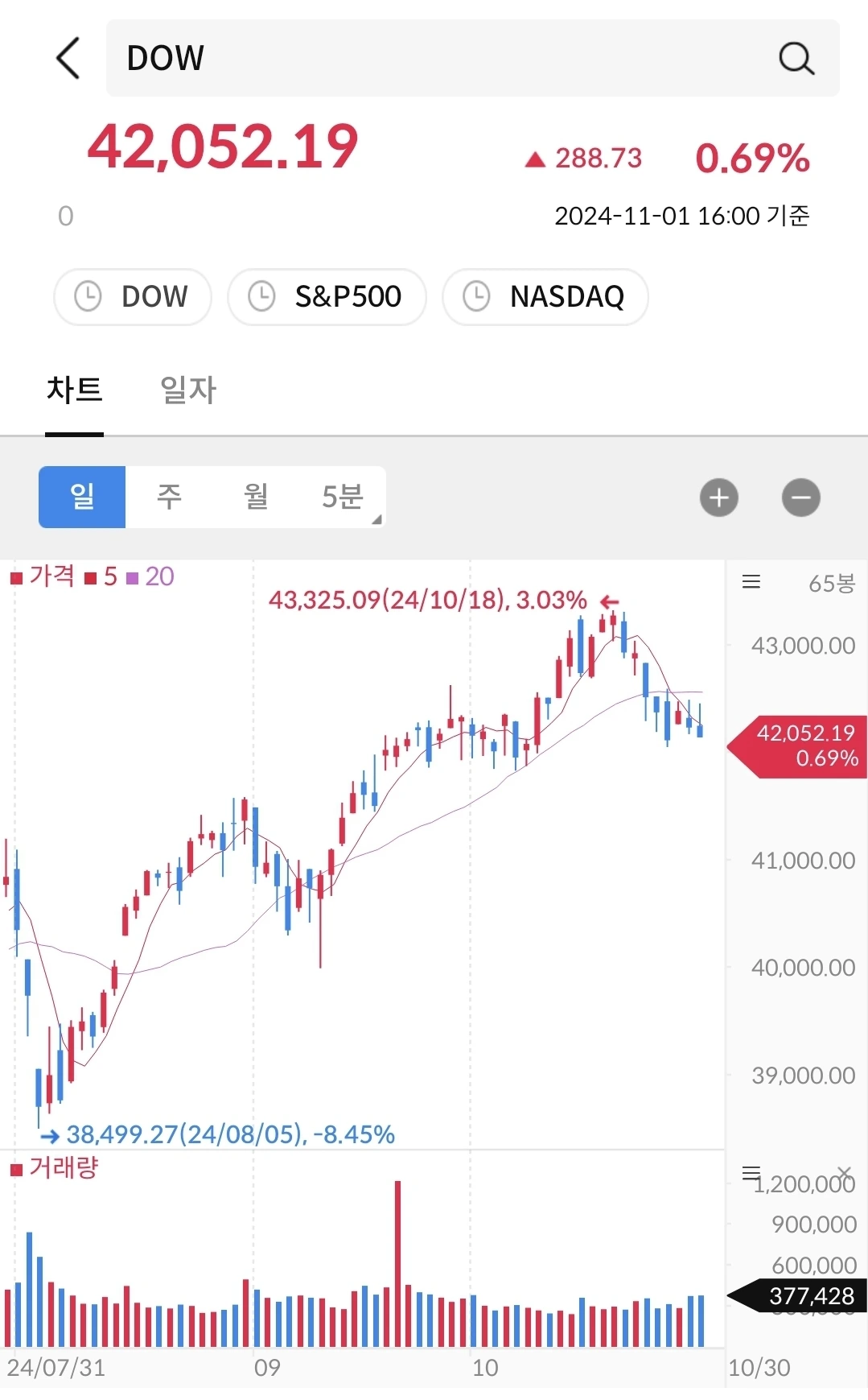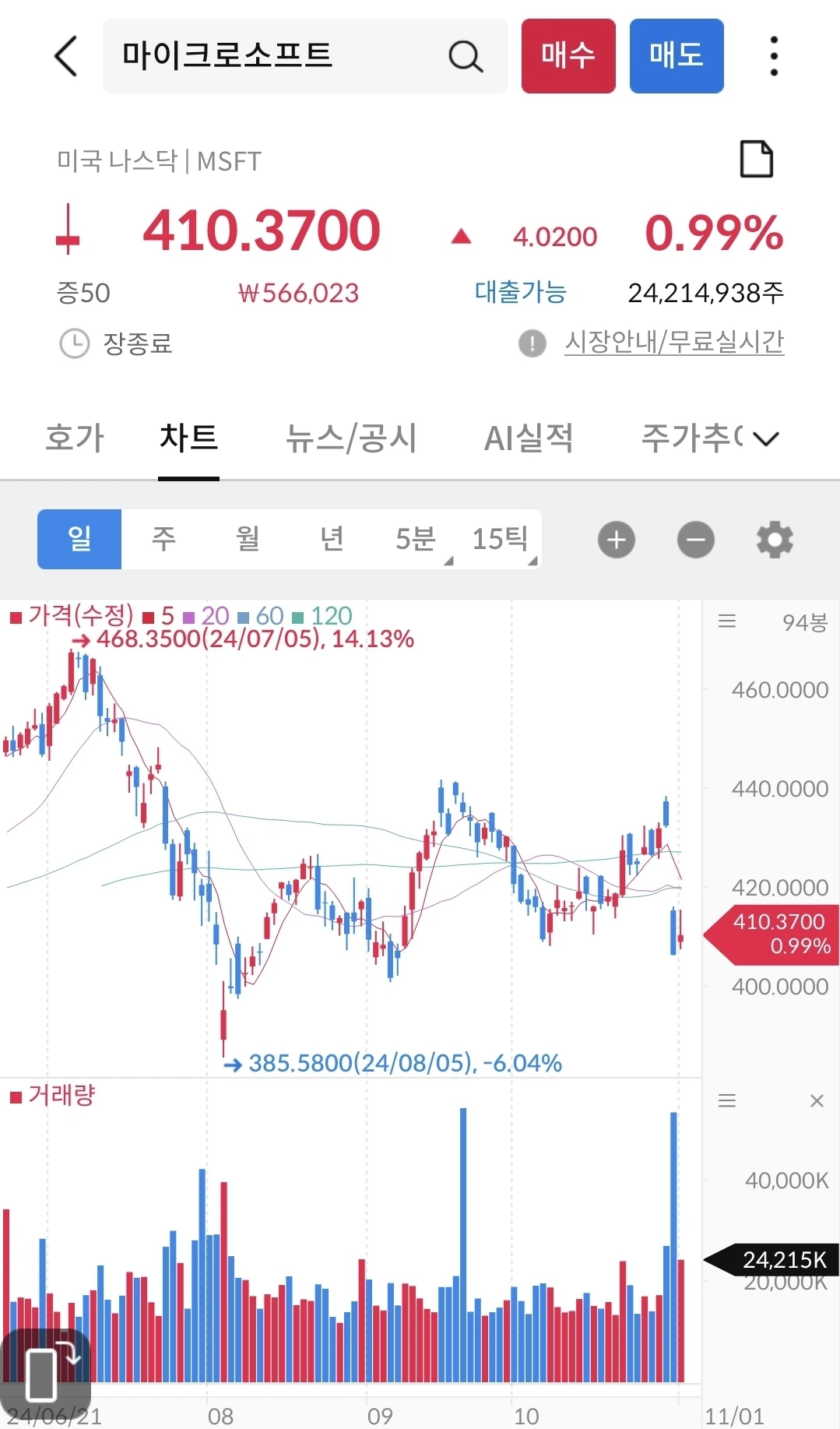 목요일에 급하강했다. 그리고 다시 상승으로 이어질 듯 보인다. 다음 주 대선 결과를 보면 알 수 있겠지만, 길게 보면 우상향이다. 목요일과 금요일에 기회라고 생각해서 마소를 몇 주 매수 했다. 분할 매수를 하기는 했지만, 좀 더 기다렸다가 들어 갔어야 하는데, 기다림에 실패를 했다. 아쉬웠다. 현재 0.8% 마이너스다.