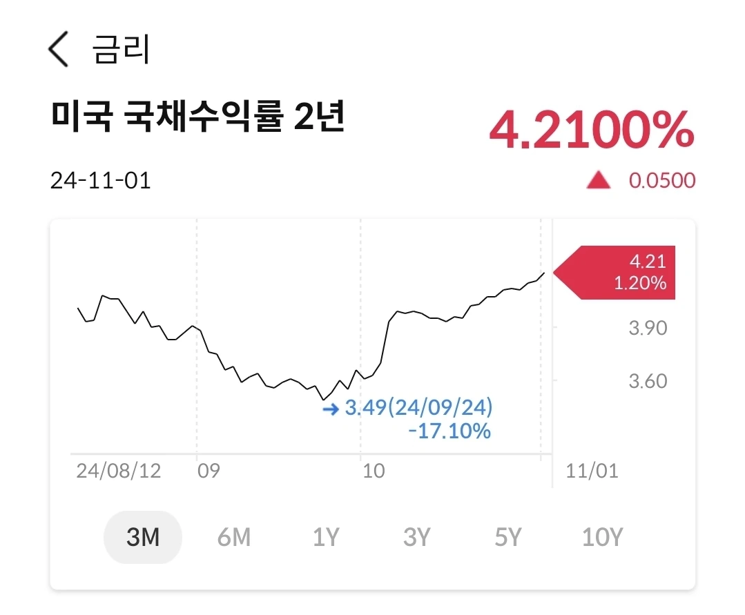 2년물과 10년물 국채수익률은 지난 한 달간 꾸준히 상승했다. 지금도 상승 중이다. 시장은 경제침체 쪽으로 생각을 하고 있지만, 우리 앞에는 미대선과 11월 금리인하 라는 불확실성이 있어서 11월의 국채수익률의 방향은 아직 모른다가 답이다.