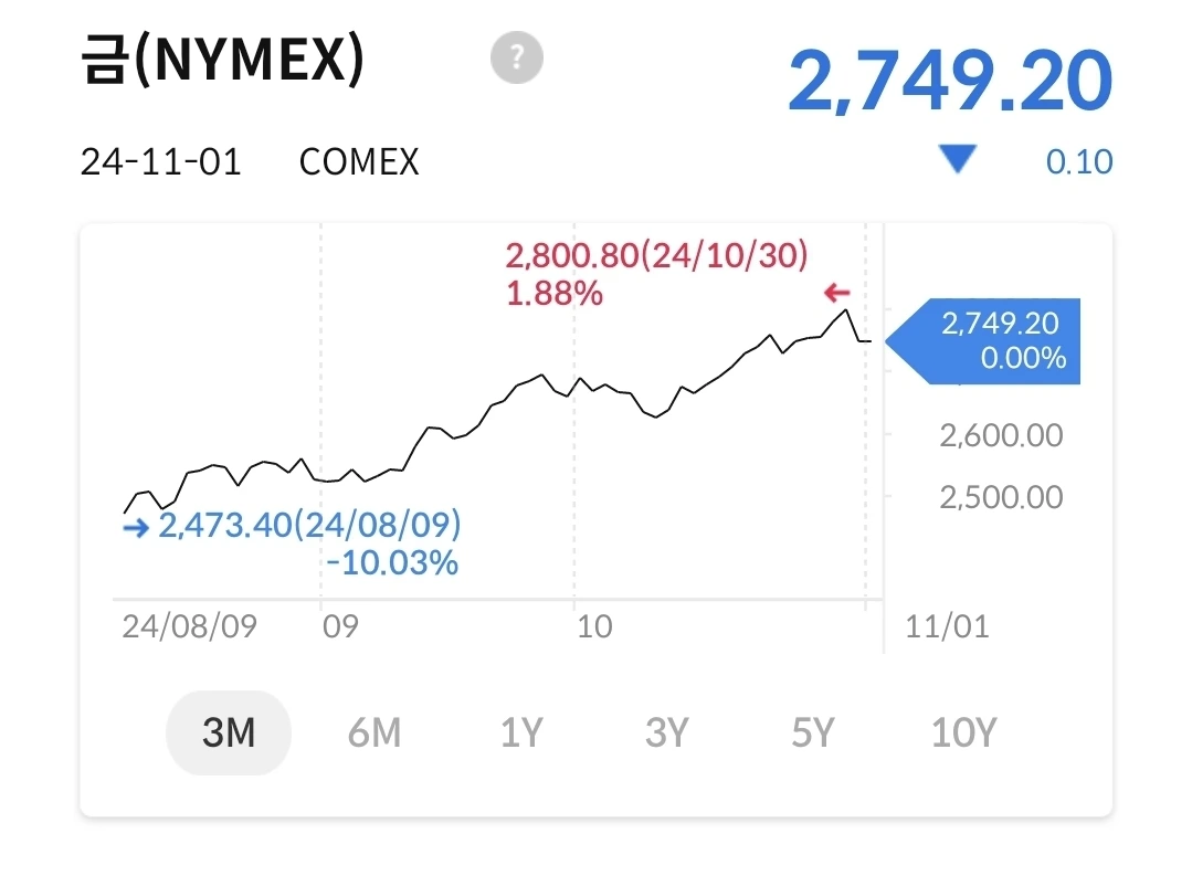 금가격은 지속 상승 중인데, 이번 주에 잠시 숨고르기에 들어 갔는지 약간 하락 했다. 그래도 계속 우상향 할 것이다. 채권수익률이 올라갈수록 금과 비트코인에 돈이 몰리는 상황이다. 이미 많이 올라서 가격 부담이 있는데, 어떤 전문가는 3000불을 넘을 것이라고 한다.