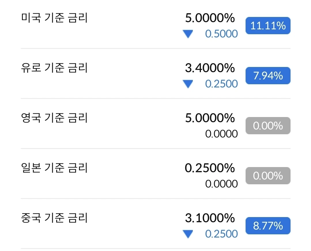 이번 주에 특별히 변동이 있지는 않았으나, 나라별로 금리 차이는 볼 수 있다. 물론 미국을 기준으로 비교하면 우리의 위치를 알 수 있다. 한국의 기준금리는 10월 11일에 0.25% 인하여 3.25% 이다. 일본을 제외하면, 우리는 중국보다 높고, 미국/유로/영국보다 낮다.