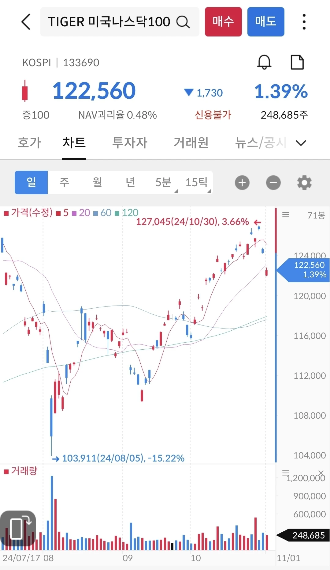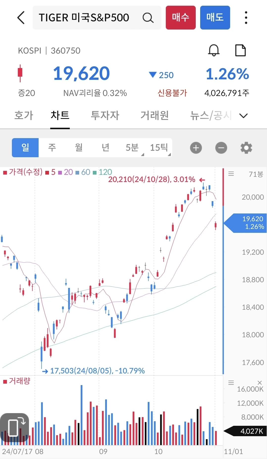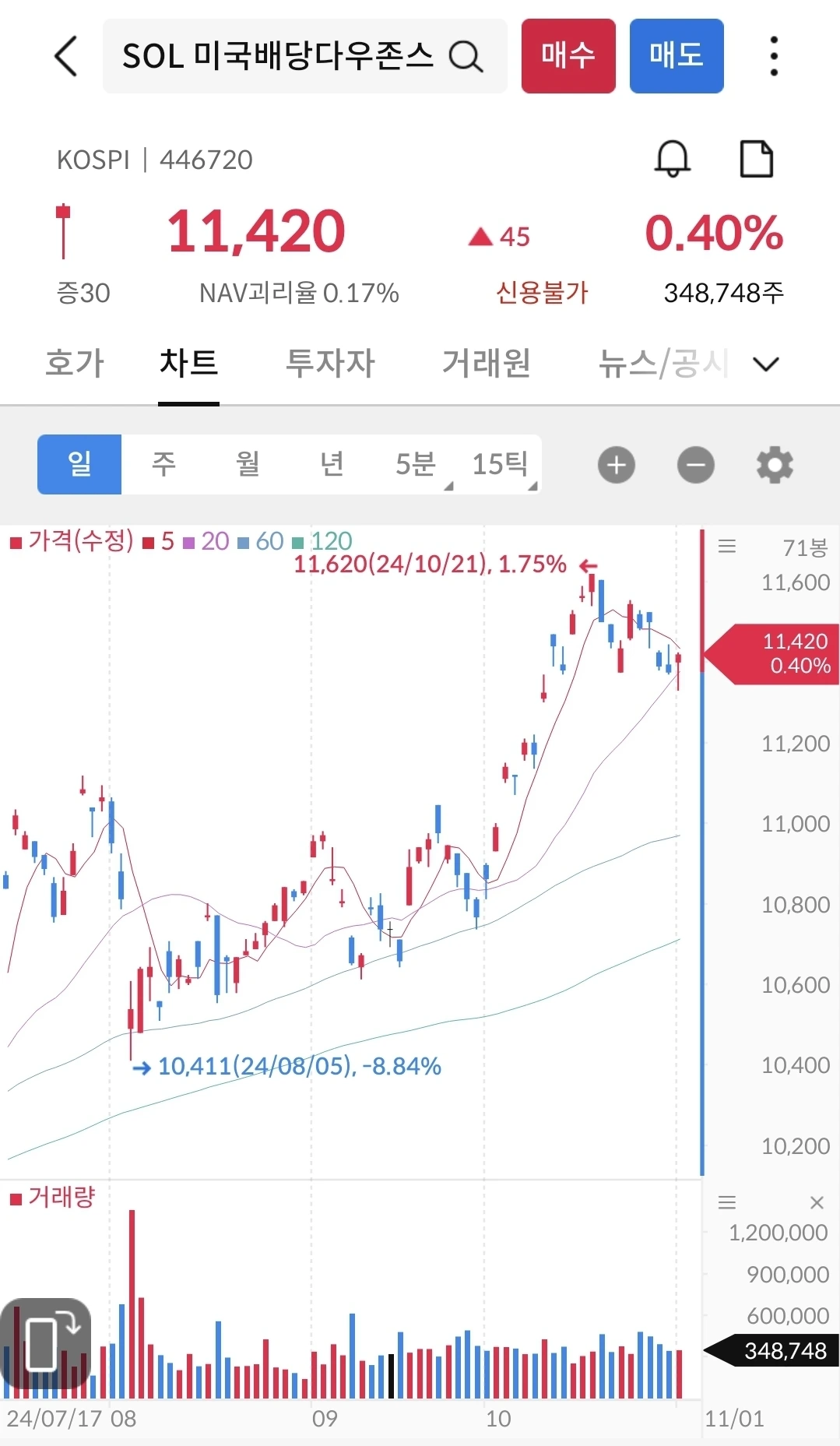 나스닥과 동일한 그래프를 보여준다. 조정 후에 다시 올라가지 않을까? 차주 미대선 후에 어떻게 될지는 알 수 없지만, 연금 개시가 되기 전에 지속 상승할 것이다. 시장에 돈이 많이 풀리면 돈의 가치가 하락하기 때문에 그만큼의 헷징을 자연스럽게 하면서 상승하는 것이다.