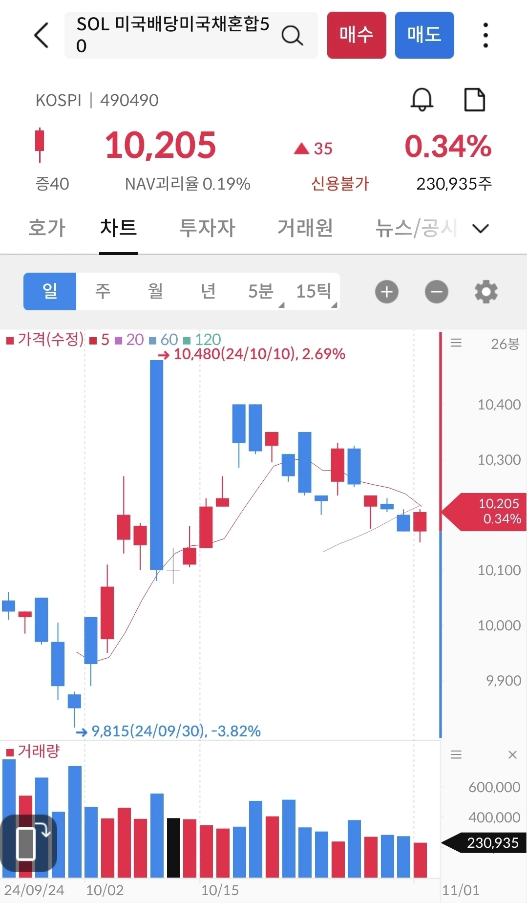 미국채를 추종하지만, 배당을 주기 위해서 배당주에 같이 투자하는 상품이다. 다행이도 안전자산 30%에 포함되어 있어서 자연스럽게 미국 주식에도 투자를 하는 것이다. 9월에 출시된 신상으로 거래량도 많다. 꾸준히 모아 가면 도움이 될 듯하다.