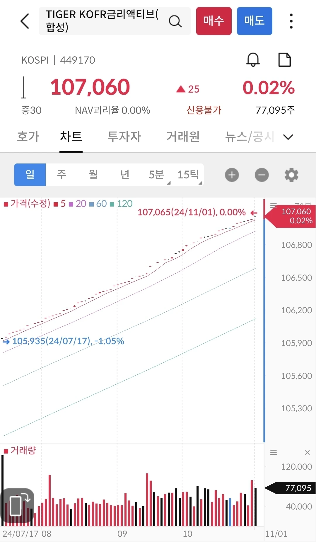 안전자산 30%를 맞추기 위한 파킹ETF다. 지난 주보다 0.05% 상승했다. 거북이와 같이 꾸준히 우상향 중이다. 변화를 느끼기 어려울 정도다.