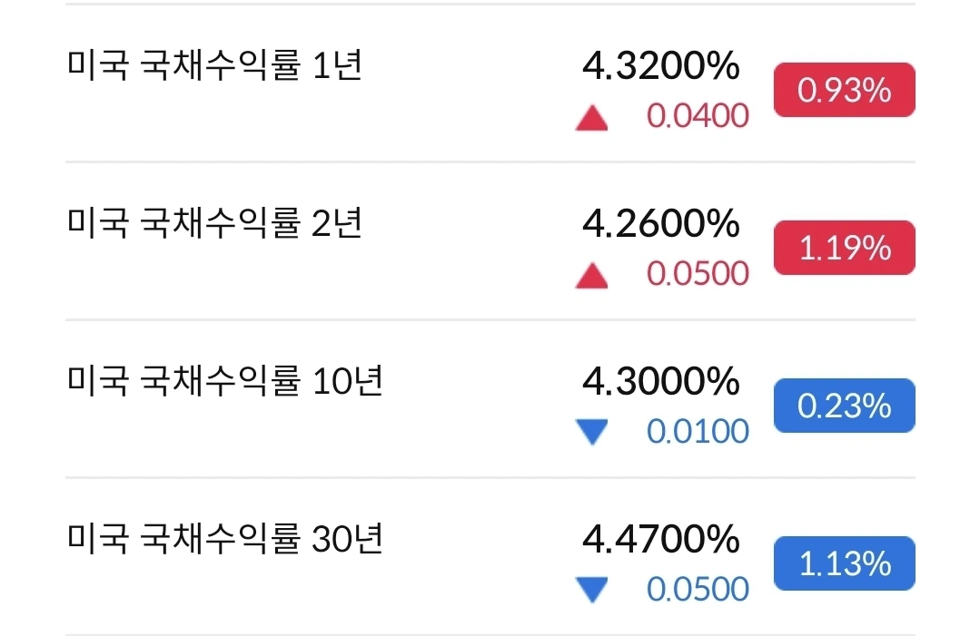 2년물도 오르고, 10년물도 오르고 있다. 2년 물은 지속 상승 중인데, 10년물은 조정이 들어갔다. 미국채 수익률이 올라간다는 의미는 국채 가격이 하락한다는 의미다.