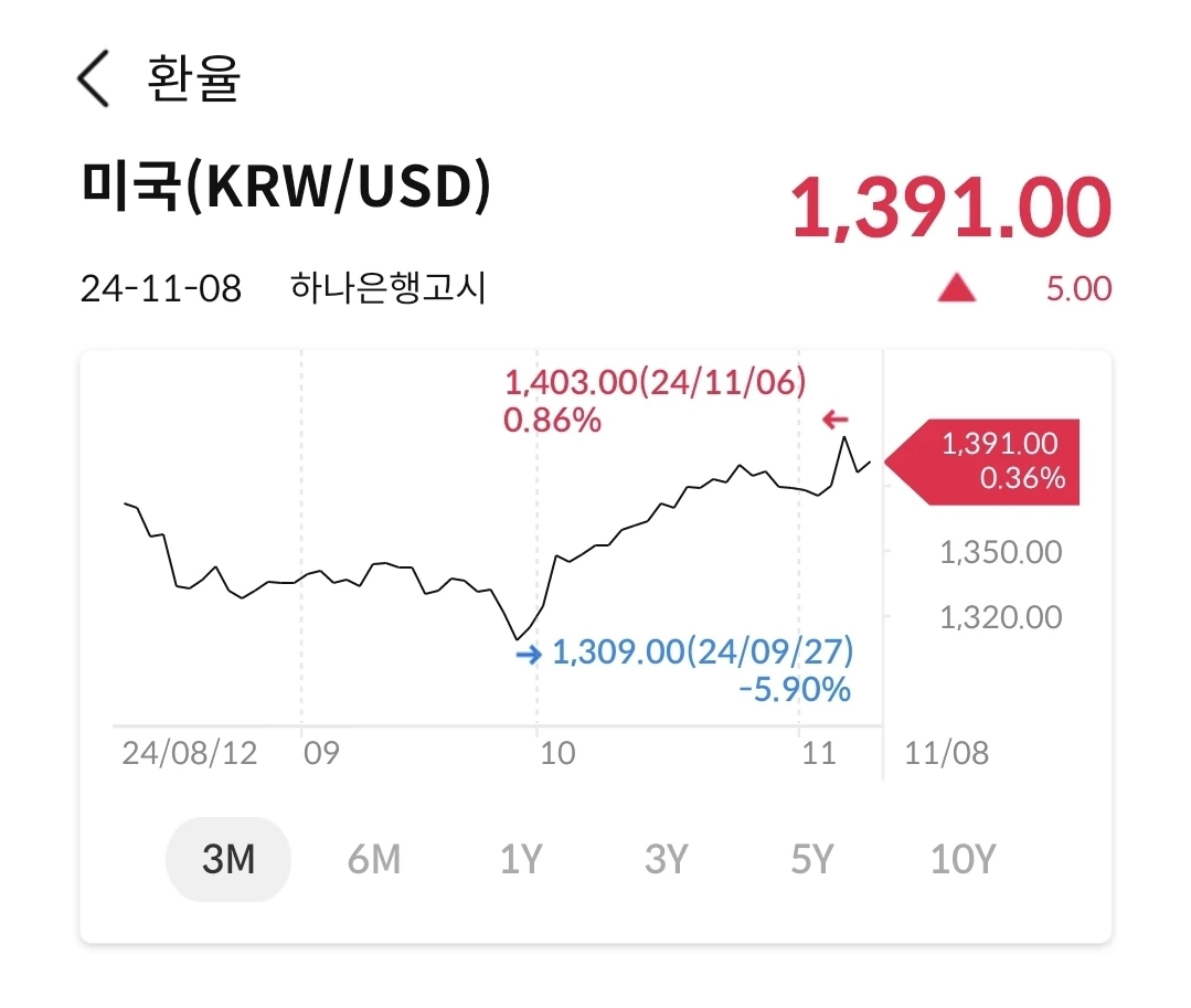 1309원에서 1403원을 터치하고 1391원으로 마감했다. 지난 한달간 환율이 약 100원정도 상승했다. 이런 경우도 드문 일인 듯하다. 한국 경제와 화폐의 가치가 크게 떨어졌다. 앞으로 투자할 때 고려해야 할 중요한 요소 중에 하나다. 미금리가 인하되었는데도 달러강세가 지속되고 있다.