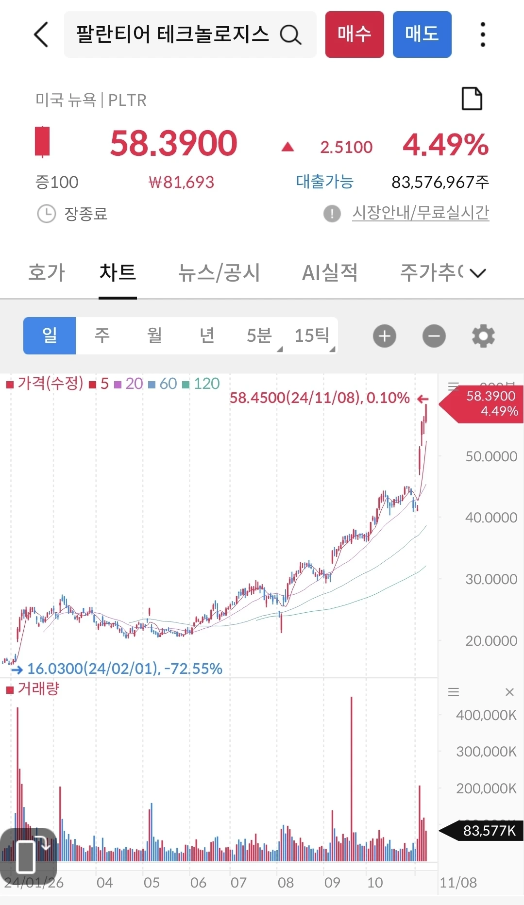 1월에 16불이었는데, 11월에 58불이다. 좀 더 지켜 보자.