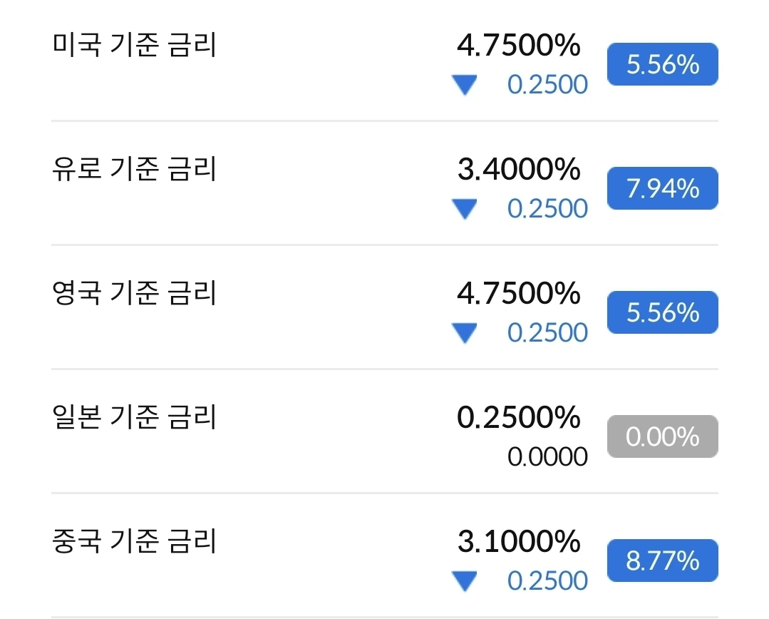 미국 기준금리 0.25% 인하. 미국과 영국의 기준금리가 동일하다. 같이 움직이고 있다. 그래도 아직 많이 높은 편이다. 고금리를 이렇게 오래 운영해도 크게 문제는 없다는게, 그게 더 큰 문제인 듯하다.