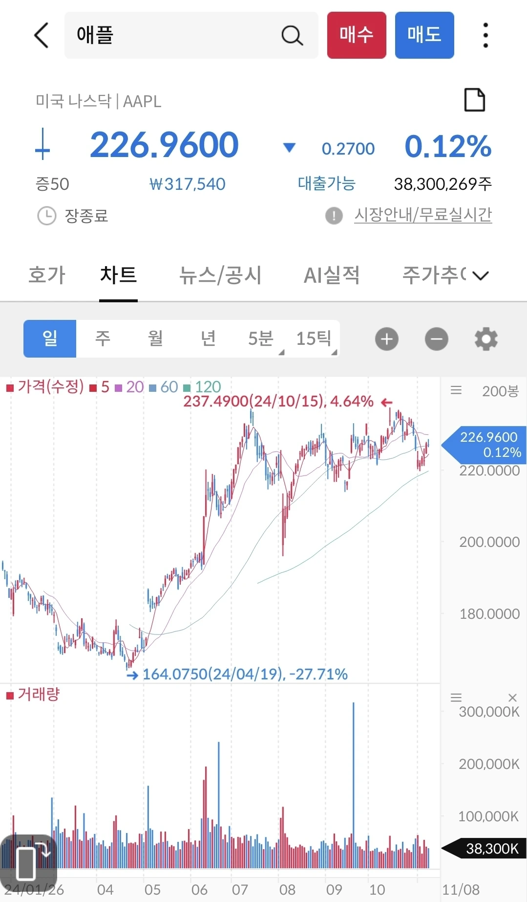 마소와 움직임이 크게 달라 보이지 않는다. 시장의 큰 이슈에는 크게 반응없이 자기 길을 열심히 가고 있다. 사실 길게 보면, 내가 투자해야 할 종목은 마소와 애플이 맞는다. 테슬라, 엔비디아처럼 롤러코스트를 타는 종목은 솔직히 두렵다. 너무 오르고 많이 떨어지고, 이슈에 크게 반응하는 기업은 나의 투자성향과 맞지 않는다.