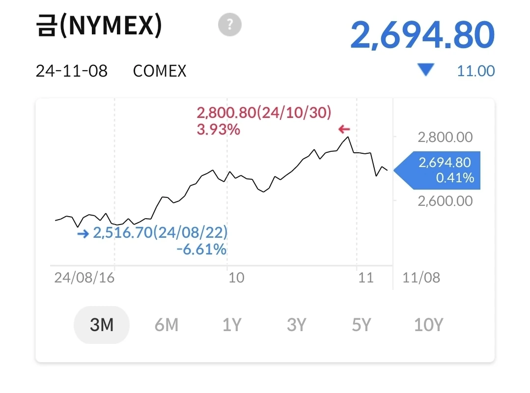 금가격이 오랜만에 하향세이다. 2800불을 고점으로 지속 하락 중이다. 트럼프 당선이후 강달러 영향으로 안전자산에 대한 선호도가 떨어졌단다. 그래서, 하락 중인데, 언제까지 지속될지는 모르겠다. 올해 금가격이 약25% 정도 상승했다고 한다.
