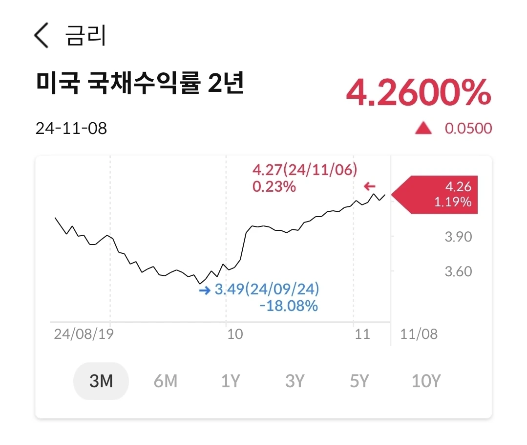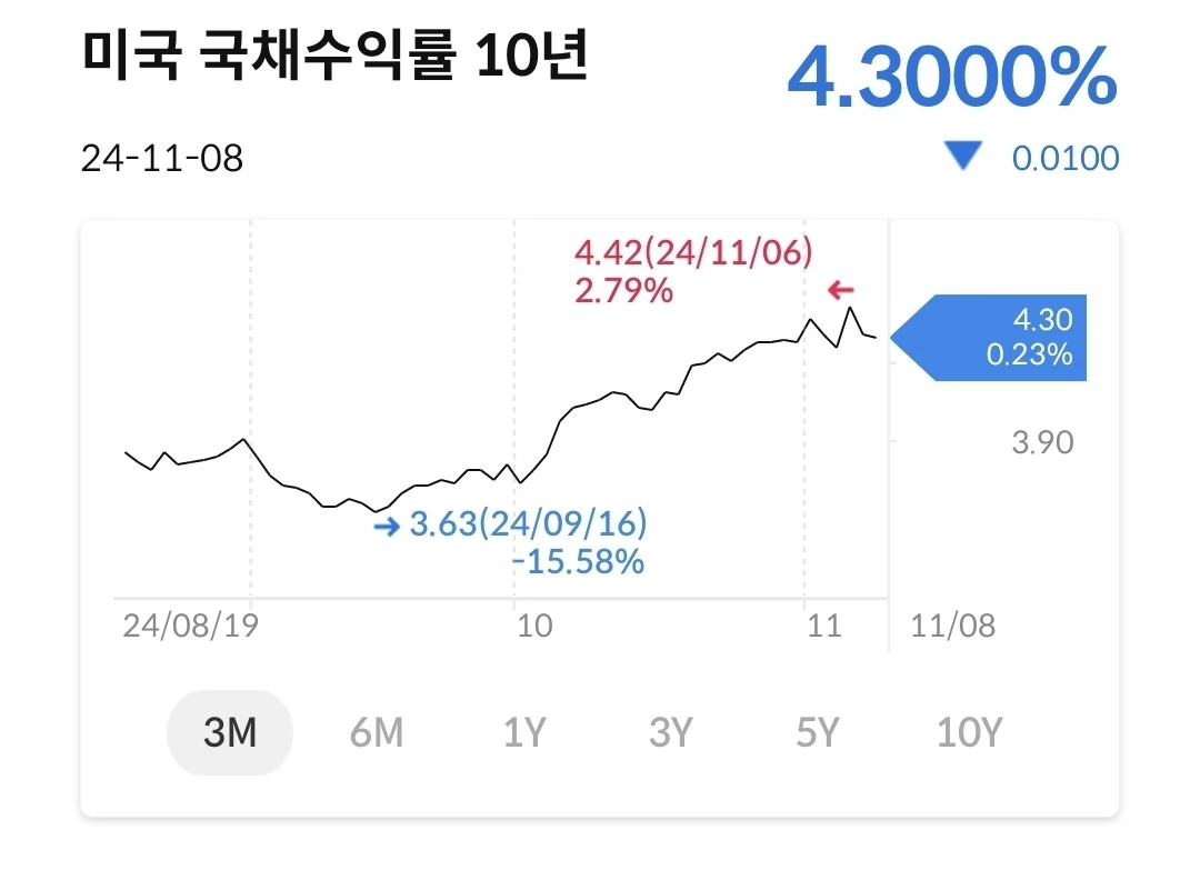 금리가 인하되면, 미국채가격이 올라가면서 수익률이 내려가야 하는데 예상하지 못한 일이다. 트럼프 당선과 관계가 있는 듯 하다. 좀 더 지켜보자.