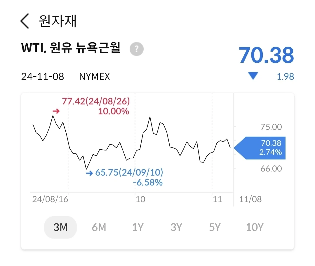 유가는 60불 중반에서 70불 중반 박스 안에서 움직이는 중이다. 시장에는 악재가 더 많아서 언제 더 떨어질지 모르는 상황이다. 유가는 인플레이션이 큰 영향을 주는 팩트이기 때문에, 미국에서는 75불이상 올라가는 것을 반기지 않을 듯 하다.