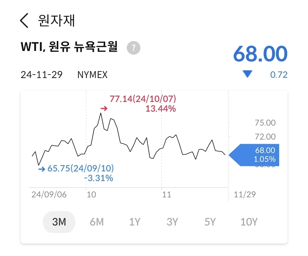 이스라엘 휴전 소식에 유가는 하락세로 전환됐다. 또한, 공급대비 수요가 줄어들었다는 뉴스는 가격하락 압력을 시장에서 주고 있다. 우크라이나가 러시아에 서방 미사일을 쏠 때만 해도 77불까지 올라 갔으나, 그 후로 좋은 소식만 전해져서 유가에는 악재로 작용했다.