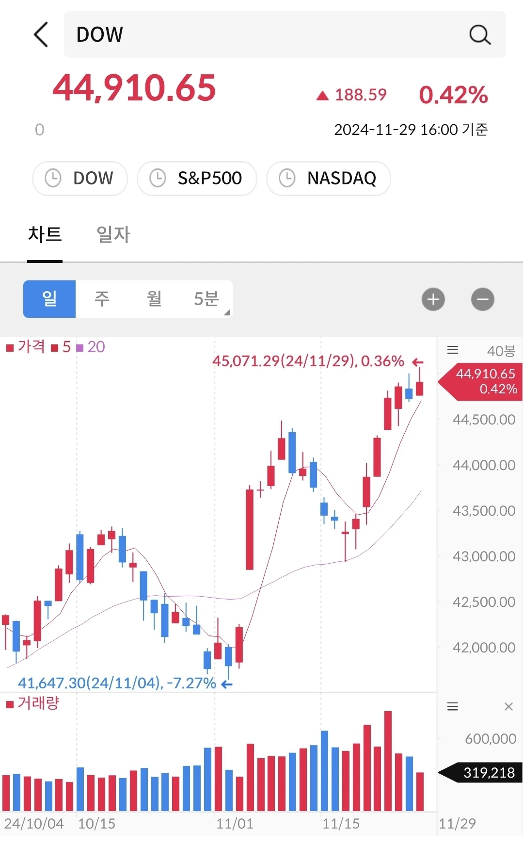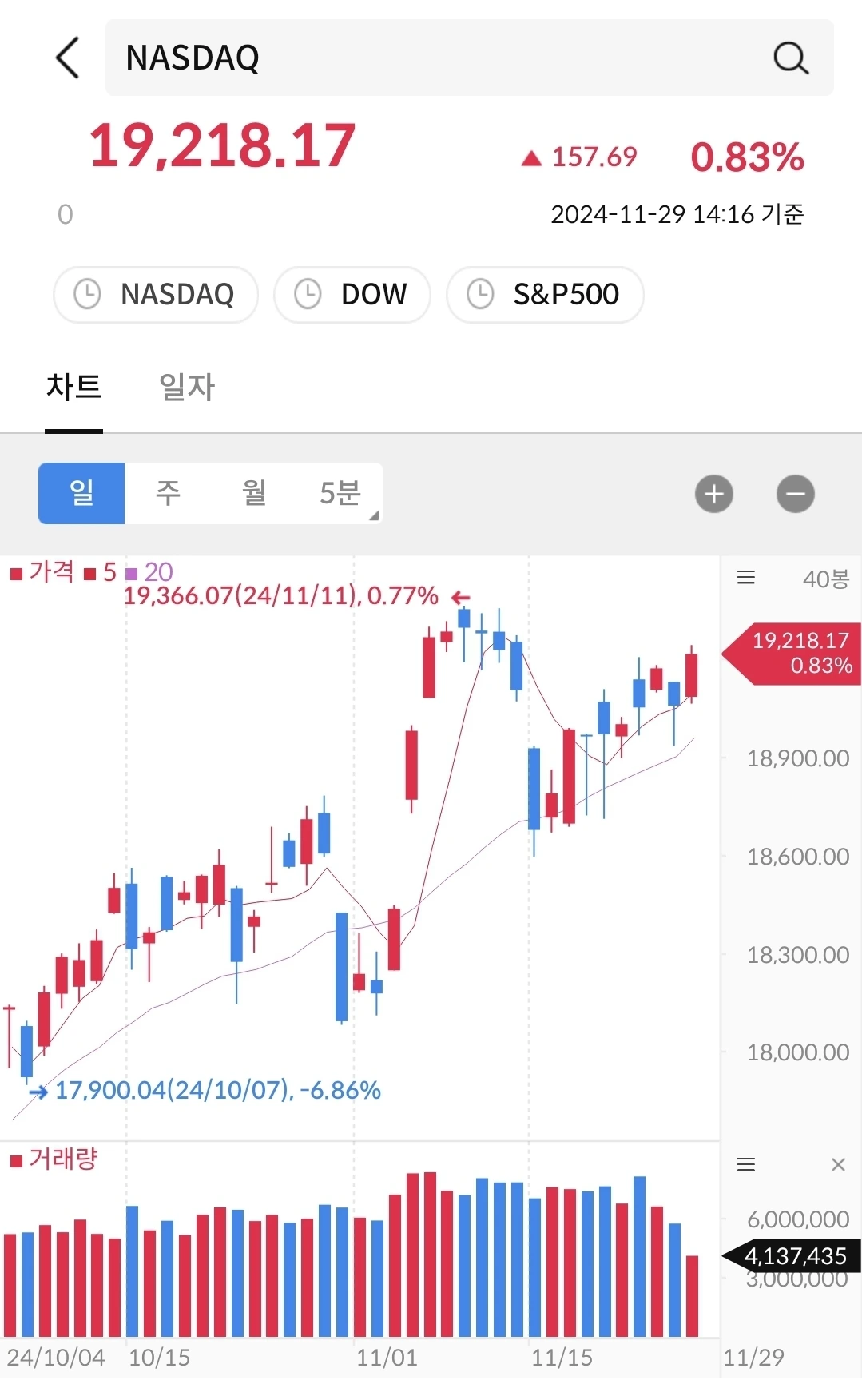 다우지수나 S&P500에 비해서 상대적으로 덜 올랐다.하지만 지난 주보다는 상승 트랜드에 가깝다. 등락은 있으나 꾸준히 우상향 중이다. 지난 10월 4일과 11월 29일을 선으로 쭉 그으면 우상향이 더 확실하게 잘 보인다. 등락은 있으나, 우상향을 꾸준히 만들고 있다.
