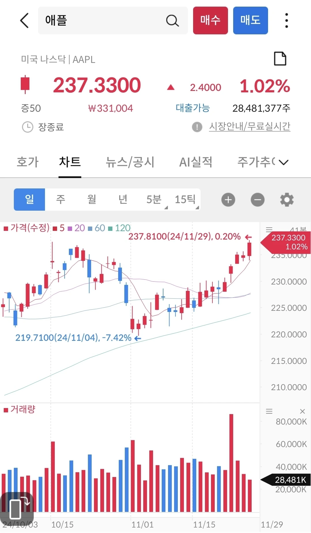 팔란티어와 함께 꾸준히 매수하던 주식이다. 나는 애플제품을 좋아한다. 계속 쓰다 보니 어느 날부터인가 나에게 맞는 제품만 파는 회사 인 줄 알았다. 그래서 꾸준히 매수를 했다. 내 나름의 기준으로 가치평가를 했고, 잘 나갔는데 어느 날부터 미래가 잘 안그려 졌다. 애플카도 포기하고. 워런버핏도 계속 팔고. 그래서 지난 2월에 다 정리하고 마소로 갈아 탔다.