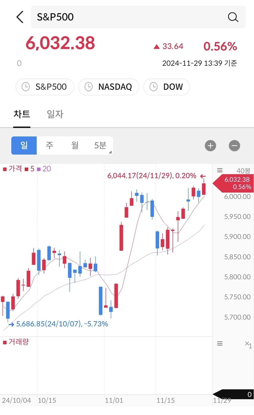 장중 최고치 6천을 찍었다. 지난 주부터 꾸준히 상승하여 우상향 그래프를 보여준다. 우상향의 기울기 차이일 뿐 시장의 좋은 소재들을 모아서 잘 반영하고 있다. 12월도 꾸준히 상승할 듯 보이며 트럼프 취임때까지는 우상향을 할 듯 하다.
