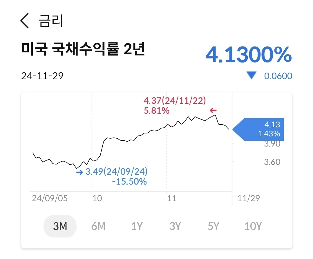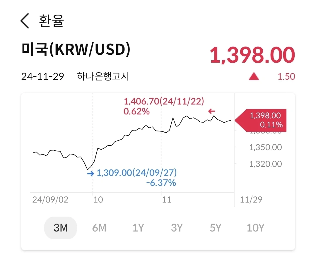 9월말에 1309원을 찍고 꾸준히 상승하여 지금은 거의 1400원대에 고착화 되었다. 이번에 한은에서 깜짝 금리인하를 실시하여 원화절하를 더 가속화하는 느낌이다. 그러나, 운이 좋게도 12월 미국 금리인하 시나리오가 우세해지면서, 잠시 원달러 환율도 숨고르기 중이다. 이러다가 1400원대 진입을 할 듯하다.
