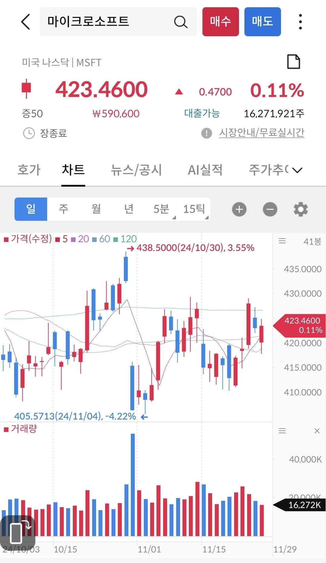 마소 평단가는 415불이다. 지난 405불일 때 더 살까 했는데, 조금만 사서 평단가를 낮춘것이다. 마소는 기회가 오면 꾸준히 매수할려고 한다. 다행인지 마소가 요즘에 횡보하고 있어서 다시 한 번 더 405불대가 올 수 있을 것 같고, 그 시기가 오면 매수할려고 기다리는 중이다.