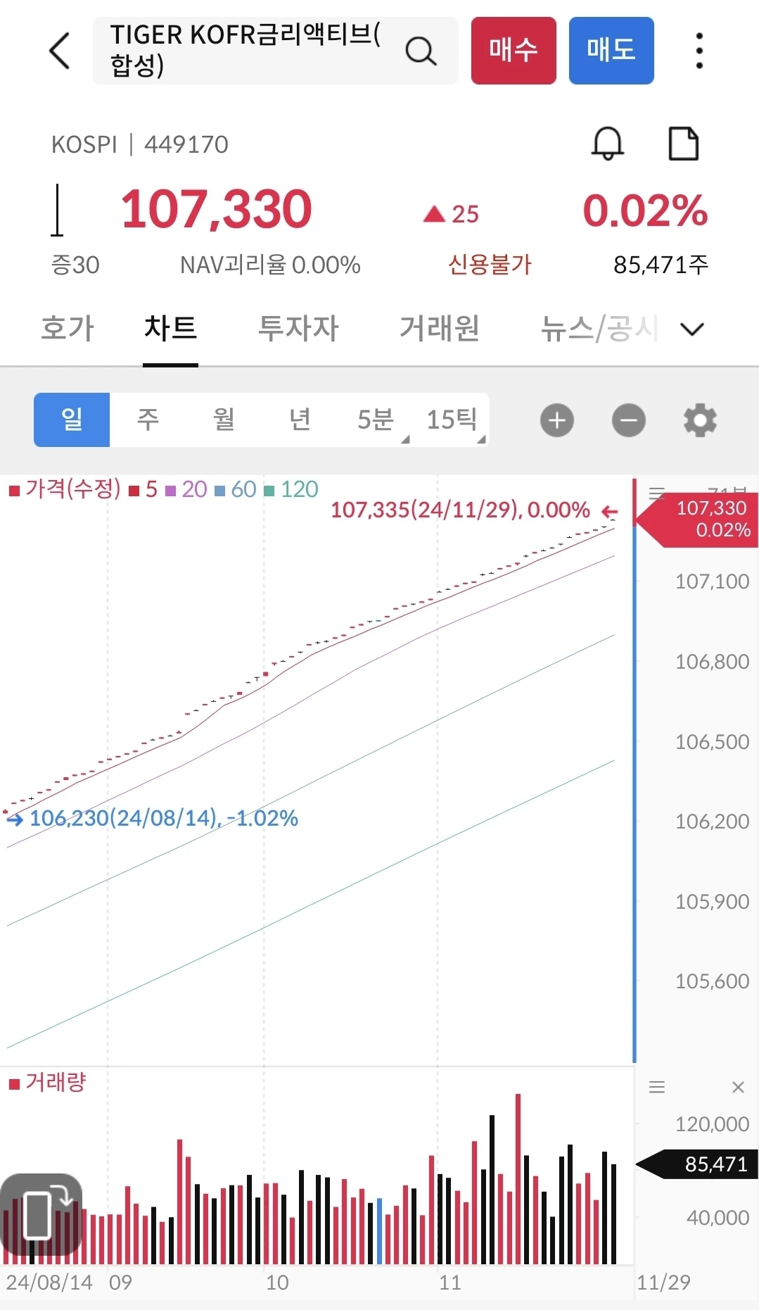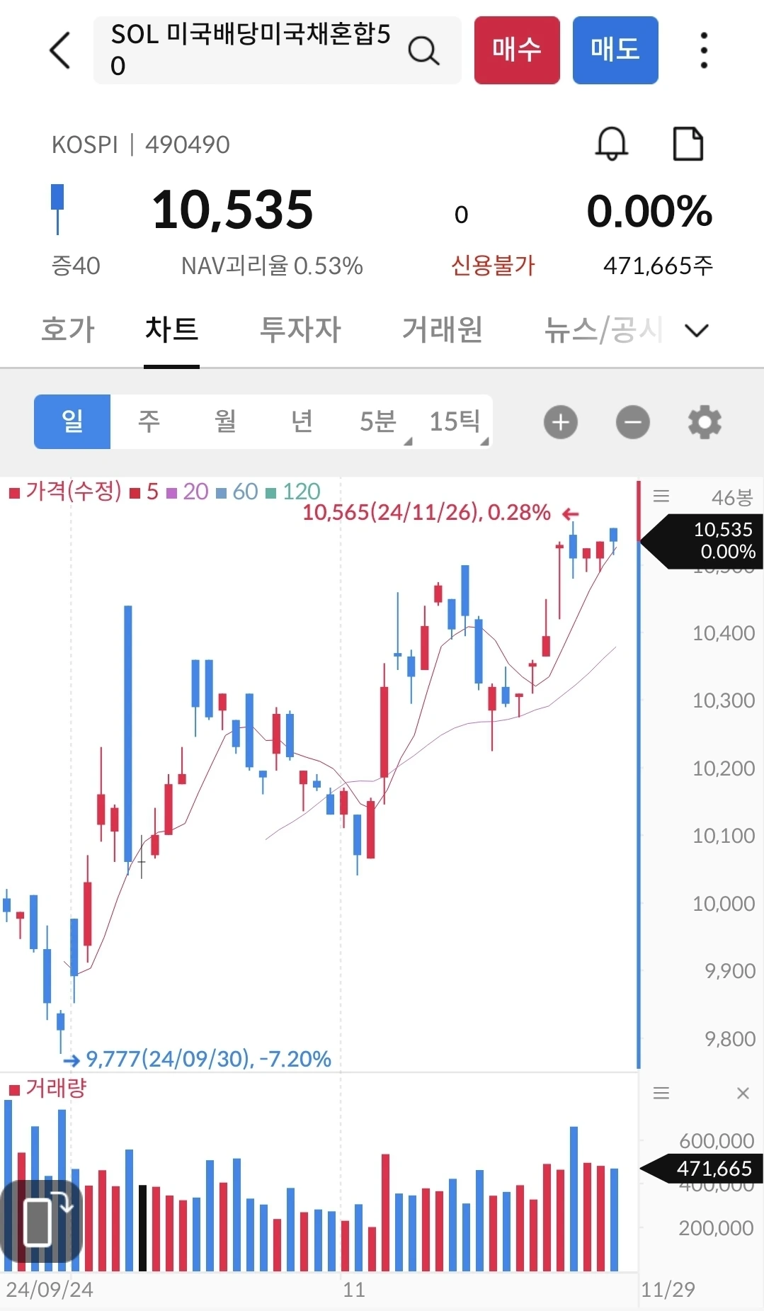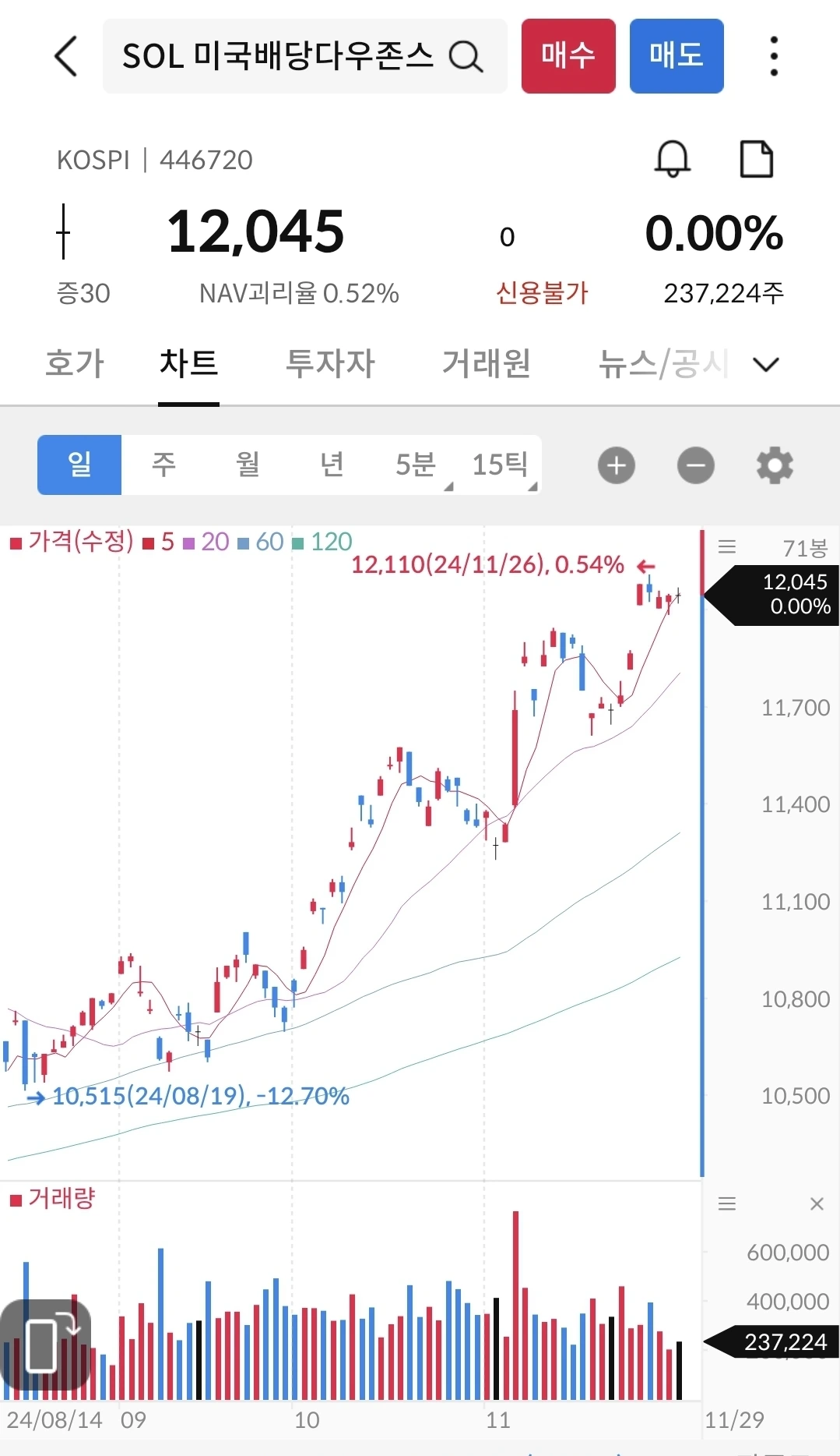 지난 9월에 출시한 이후 지속 우상향 중이다. 거래량도 많고 제대로 자리 잡은 듯 하다. 이 친구도 분할 매수하면 평균은 먹을 수 있을 듯 하다.